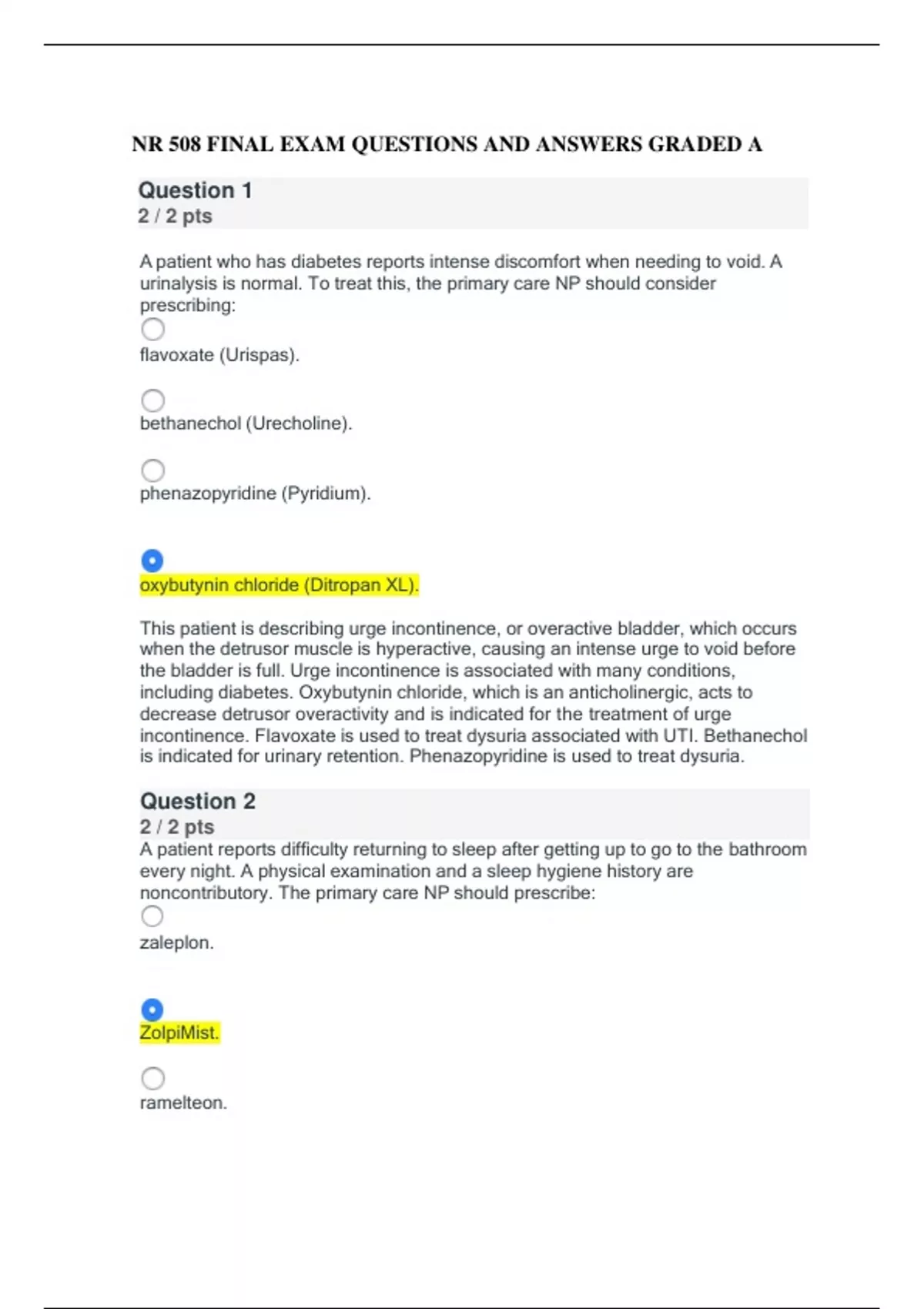 NR 508 FINAL EXAM QUESTIONS AND ANSWERS GRADED A A patient who has diabetes reports intense discomfort when needing to void. A urinalysis is normal. To treat this, the primary care NP should consider prescribing.....
