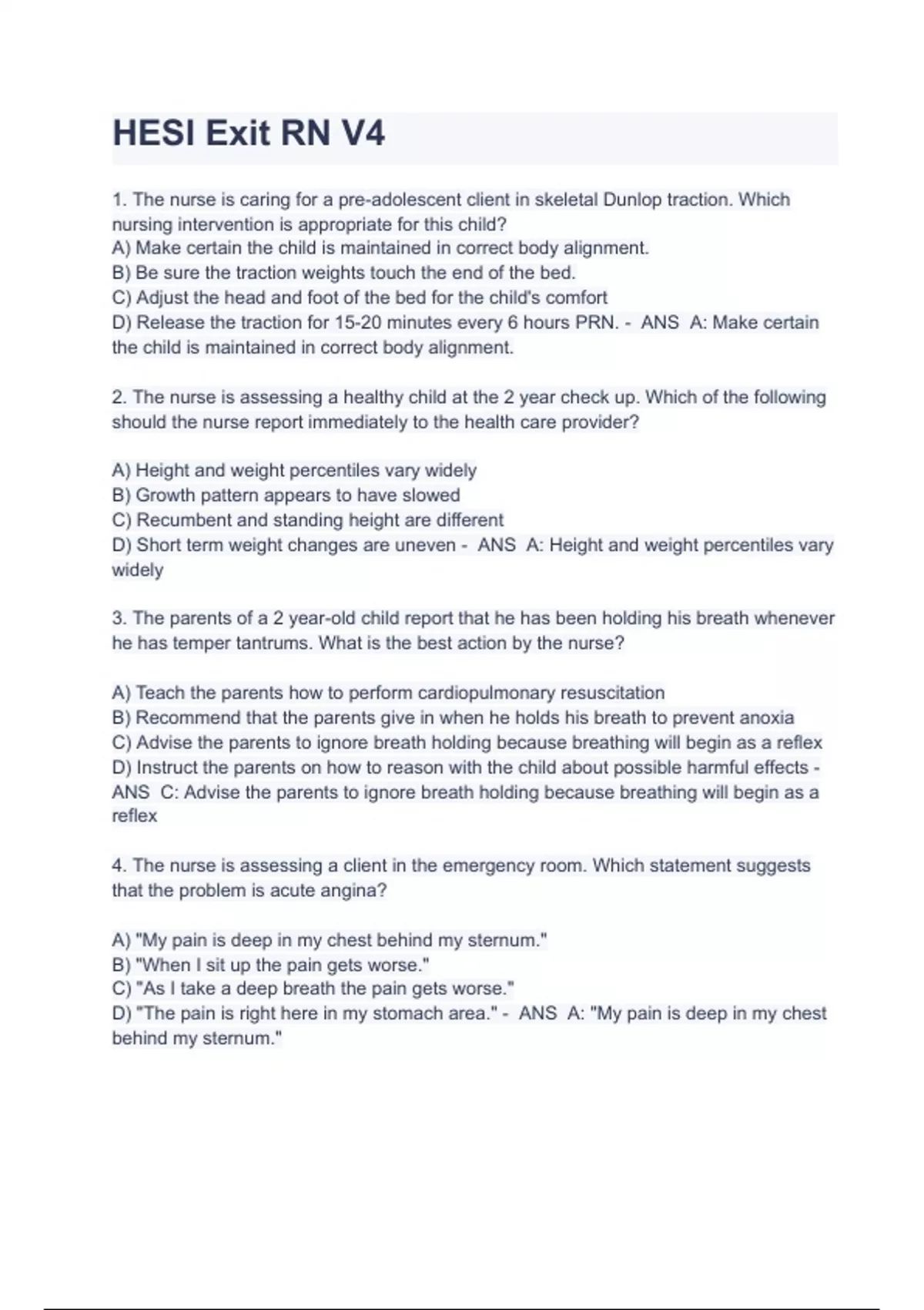 HESI Exit RN V4 ALL VERIFIED QUESTIONS AND 100% CORRECT ANSWERS 1. The nurse is caring for a pre-adolescent client in skeletal Dunlop traction. Which nursing intervention is appropriate for this child? A) Make certain the child is maintained in correct body alignment. B) Be sure the traction weights touch the end of the bed. C) Adjust the head and foot of the bed for the child's comfort D) Release the traction for 15-20 minutes every 6 hours PRN. - ANS A: Make certain the child is maintained in correct body alignment. 2. The nurse is assessing a healthy child at the 2 year check up. Which of the following should the nurse report immediately to the health care provider? A) Height and weight percentiles vary widely B) Growth pattern appears to have slowed C) Recumbent and standing height are different D) Short term weight changes are uneven - ANS A: Height and weight percentiles vary widely 3. The parents of a 2 year-old child report that he has been holding his breath whenever he has temper tantrums. What is the best action by the nurse? A) Teach the parents how to perform cardiopulmonary resuscitation B) Recommend that the parents give in when he holds his breath to prevent anoxia C) Advise the parents to ignore breath holding because breathing will begin as a reflex D) Instruct the parents on how to reason with the child about possible harmful effects - ANS C: Advise the parents to ignore breath holding because breathing will begin as a reflex 4. The nurse is assessing a client in the emergency room. Which statement suggests that the problem is acute angina? A) "My pain is deep in my chest behind my sternum." B) "When I sit up the pain gets worse." C) "As I take a deep breath the pain gets worse." D) "The pain is right here in my stomach area." - ANS A: "My pain is deep in my chest behind my sternum." 5. The nurse is assessing the mental status of a client admitted with possible organic brain disorder. Which of these questions will best assess the function of the client's recent memory? A) "Name the year." "What season is this?" (pause for answer after each question) B) "Subtract 7 from 100 and then subtract 7 from that." (pause for answer) "Now continue to subtract 7 from the new number." C) "I am going to say the names of three things and I want you to repeat them after me: blue, ball, pen." D) "What is this on my wrist?" (point to your watch) Then ask, "What is the purpose of it?" - ANS C: "I am going to say the names of three things and I want you to repeat them after me: blue, ball, pen." 6. In planning care for a 6 month-old infant, what must the nurse provide to assist in the development of trust? A) Food B) Warmth C) Security D) Comfort - ANS C: Security 7. A nurse has just received a medication order which is not legible. Which statement best reflects assertive communication?