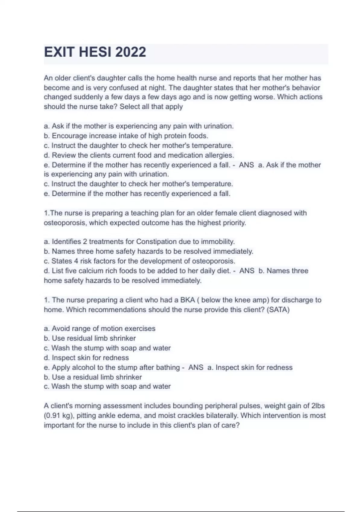 EXIT HESI 2022 QUESTIOS AND ANSWERS An older client's daughter calls the home health nurse and reports that her mother has become and is very confused at night. The daughter states that her mother's behavior changed suddenly a few days a few days ago and is now getting worse. Which actions should the nurse take? Select all that apply a. Ask if the mother is experiencing any pain with urination. b. Encourage increase intake of high protein foods. c. Instruct the daughter to check her mother's temperature. d. Review the clients current food and medication allergies. e. Determine if the mother has recently experienced a fall. - ANS a. Ask if the mother is experiencing any pain with urination. c. Instruct the daughter to check her mother's temperature. e. Determine if the mother has recently experienced a fall. 1.The nurse is preparing a teaching plan for an older female client diagnosed with osteoporosis, which expected outcome has the highest priority. a. Identifies 2 treatments for Constipation due to immobility. b. Names three home safety hazards to be resolved immediately. c. States 4 risk factors for the development of osteoporosis. d. List five calcium rich foods to be added to her daily diet. - ANS b. Names three home safety hazards to be resolved immediately. 1. The nurse preparing a client who had a BKA ( below the knee amp) for discharge to home. Which recommendations should the nurse provide this client? (SATA) a. Avoid range of motion exercises b. Use residual limb shrinker c. Wash the stump with soap and water d. Inspect skin for redness e. Apply alcohol to the stump after bathing - ANS a. Inspect skin for redness b. Use a residual limb shrinker c. Wash the stump with soap and water A client's morning assessment includes bounding peripheral pulses, weight gain of 2lbs (0.91 kg), pitting ankle edema, and moist crackles bilaterally. Which intervention is most important for the nurse to include in this client's plan of care? a. Restrict daily fluid intake to 1500 mL b. Administer prescribed diuretic c. Maintain accurate intake and output d. Weigh client every morning - ANS b. Administer prescribed diuretic The home care nurse visits a client who has cancer. The client reports having a good appetite but experiencing nausea when smelling food cooking. Which action should the nurse implement? A. Encourage family members to cook meals outdoors and bring the cooked food inside B. Instruct the client to take an antiemetic before every meal to prevent excessive vomiting