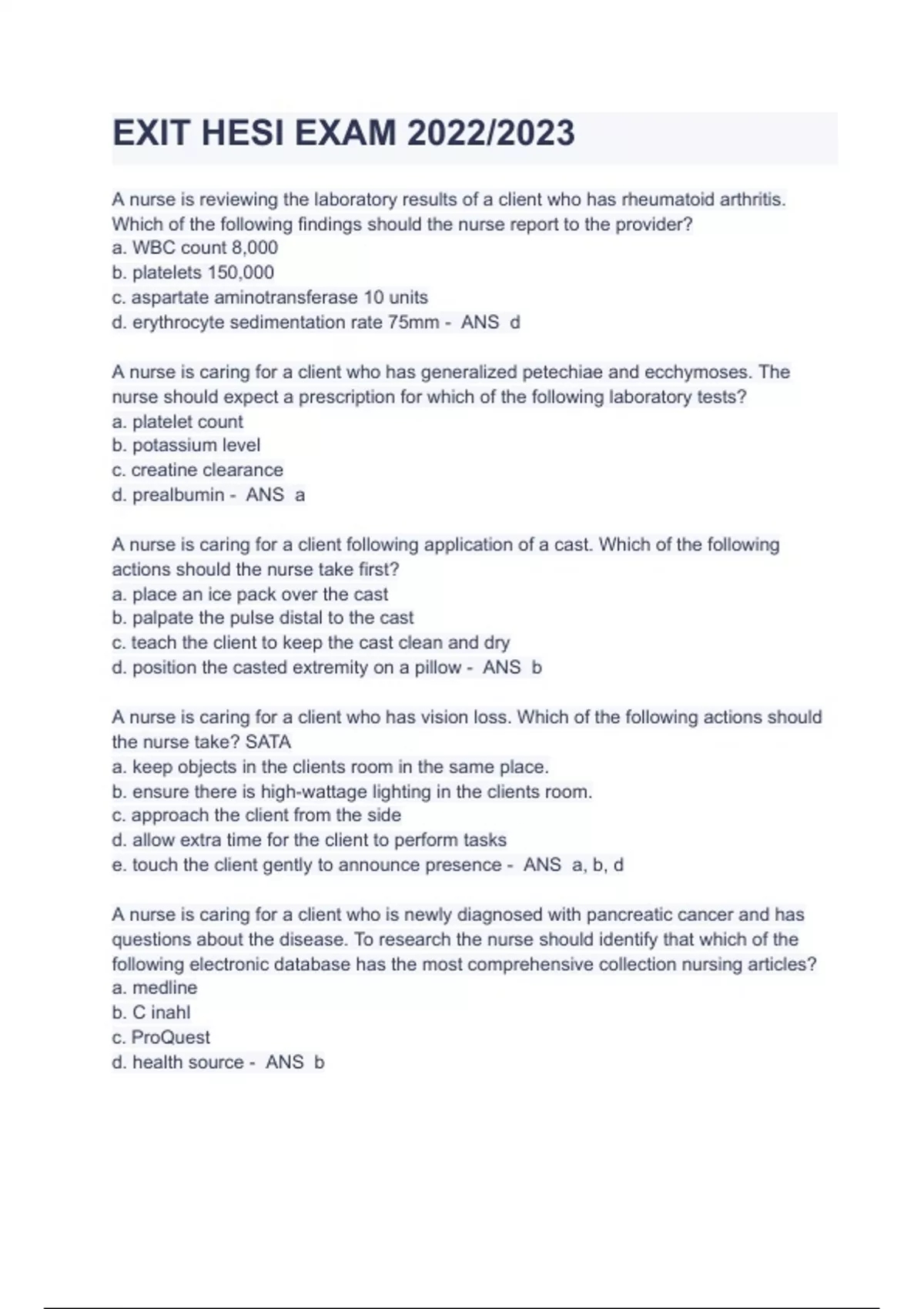 EXIT HESI EXAM 2022/2023 QUESTIONS AND ANSWERS 100% CORRECT AND VERIFIED A+ GRADED A nurse is reviewing the laboratory results of a client who has rheumatoid arthritis. Which of the following findings should the nurse report to the provider? a. WBC count 8,000 b. platelets 150,000 c. aspartate aminotransferase 10 units d. erythrocyte sedimentation rate 75mm - ANS d A nurse is caring for a client who has generalized petechiae and ecchymoses. The nurse should expect a prescription for which of the following laboratory tests? a. platelet count b. potassium level c. creatine clearance d. prealbumin - ANS a A nurse is caring for a client following application of a cast. Which of the following actions should the nurse take first? a. place an ice pack over the cast b. palpate the pulse distal to the cast c. teach the client to keep the cast clean and dry d. position the casted extremity on a pillow - ANS b A nurse is caring for a client who has vision loss. Which of the following actions should the nurse take? SATA a. keep objects in the clients room in the same place. b. ensure there is high-wattage lighting in the clients room. c. approach the client from the side d. allow extra time for the client to perform tasks e. touch the client gently to announce presence - ANS a, b, d A nurse is caring for a client who is newly diagnosed with pancreatic cancer and has questions about the disease. To research the nurse should identify that which of the following electronic database has the most comprehensive collection nursing articles? a. medline b. C inahl c. ProQuest d. health source - ANS b A nurse in the emergency department is assessing newly admitted client who is experiencing drooling and hoarseness following a brain injury. Which of the following actions should the nurse take first? a. obtain a baseline EKG b. Obtain a blood specimen for ABG analysis c. insert an 18 gauge IV catheter d. Administer 100% humidified oxygen - ANS d A nurse is planning care for a client who has unilateral paralysis and dysphagia following a right hemispheric stroke. Which of the following interventions should the nurse include in the plan? a. Place food on the left side of the client's mouth when he is ready to eat. b. Provide total care in performing the client's ADLs. c. Maintain the client on bed rest. d. Place the client's left arm on a pillow while he is sitting. - ANS d A nurse is caring for a client who is in a seclusion room following violent behavior. The client continues to display aggressive behavior. Which of the following actions should the nurse take? a. Confront the client about this behavior. b. Express sympathy for the client's situation. c. Speak assertively to the client. d. Stand within 30 cm (1 ft) of the client when speaking with them. - ANS a A nurse is caring for a client who is receiving brachytherapy for treatment of prostate cancer. Which of the following actions should the nurse take? a. Cleanse equipment before removal from the client's room. b. Limit the client's visitors to 30 min per day. c. Discard the client's linens in a double bag. d. Discard the radioactive source in a biohazard bag - ANS b A nurse is caring for a client who has severe preeclampsia and is receiving magnesium sulfate intravenously. The nurse discontinues the magnesium sulfate after the client displaces toxicity. Which of the following actions should the nurse take? a. Position the client supine b. Prepare an IV bolus of dextrose 5% in water c. Administer methylergonovine IM d. Administer calcium gluconate IV - ANS d A charge nurse is teaching new staff members about factors that increase a client's risk to become violent. Which of the following risk factors should the nurse include as the best predictor of future violence? a. Experiencing delusions b. Male gender c. Pervious violent behavior d. A history of being in prison - ANS c