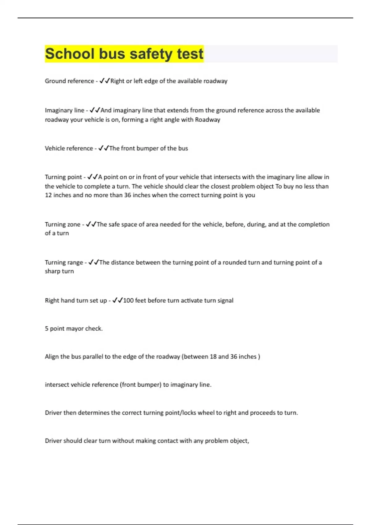 Ground reference - Right or left edge of the available roadway Imaginary line - And imaginary line that extends from the ground reference across the available roadway your vehicle is on, forming a right angle with Roadway Vehicle reference - The front bumper of the bus Turning point - A point on or in front of your vehicle that intersects with the imaginary line allow in the vehicle to complete a turn. The vehicle should clear the closest problem object To buy no less than 12 inches and no more than 36 inches when the correct turning point is you Turning zone - The safe space of area needed for the vehicle, before, during, and at the completion of a turn Turning range - The distance between the turning point of a rounded turn and turning point of a sharp turn Right hand turn set up - 100 feet before turn activate turn signal 5 point mayor check. Align the bus parallel to the edge of the roadway (between 18 and 36 inches ) intersect vehicle reference (front bumper) to imaginary line. Driver then determines the correct turning point/locks wheel to right and proceeds to turn. Driver should clear turn without making contact with any problem object,