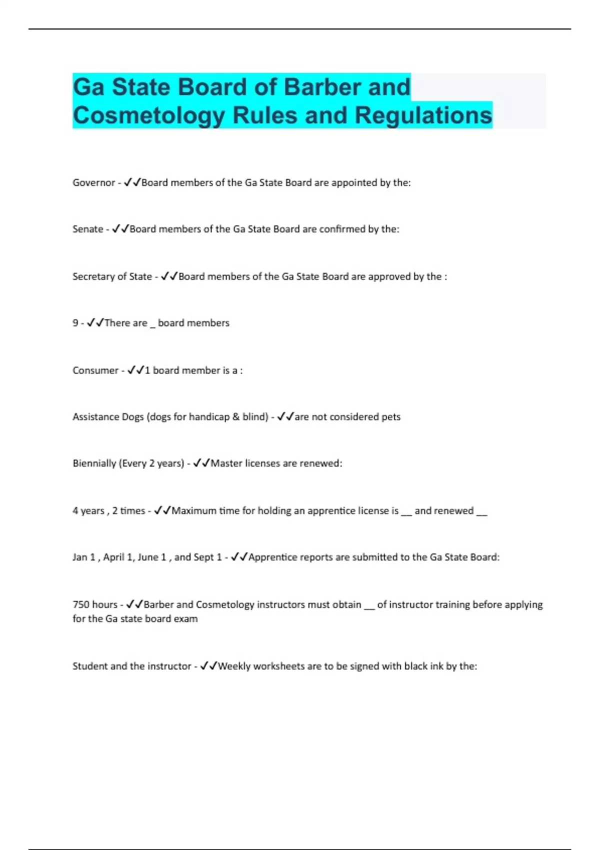 Governor - Board members of the Ga State Board are appointed by the: Senate - Board members of the Ga State Board are confirmed by the: Secretary of State - Board members of the Ga State Board are approved by the : 9 - There are _ board members Consumer - 1 board member is a : Assistance Dogs (dogs for handicap & blind) - are not considered pets Biennially (Every 2 years) - Master licenses are renewed: 4 years , 2 times - Maximum time for holding an apprentice license is __ and renewed __ Jan 1 , April 1, June 1 , and Sept 1 - Apprentice reports are submitted to the Ga State Board: 750 hours - Barber and Cosmetology instructors must obtain __ of instructor training before applying for the Ga state board exam Student and the instructor - Weekly worksheets are to be signed with black ink by the: