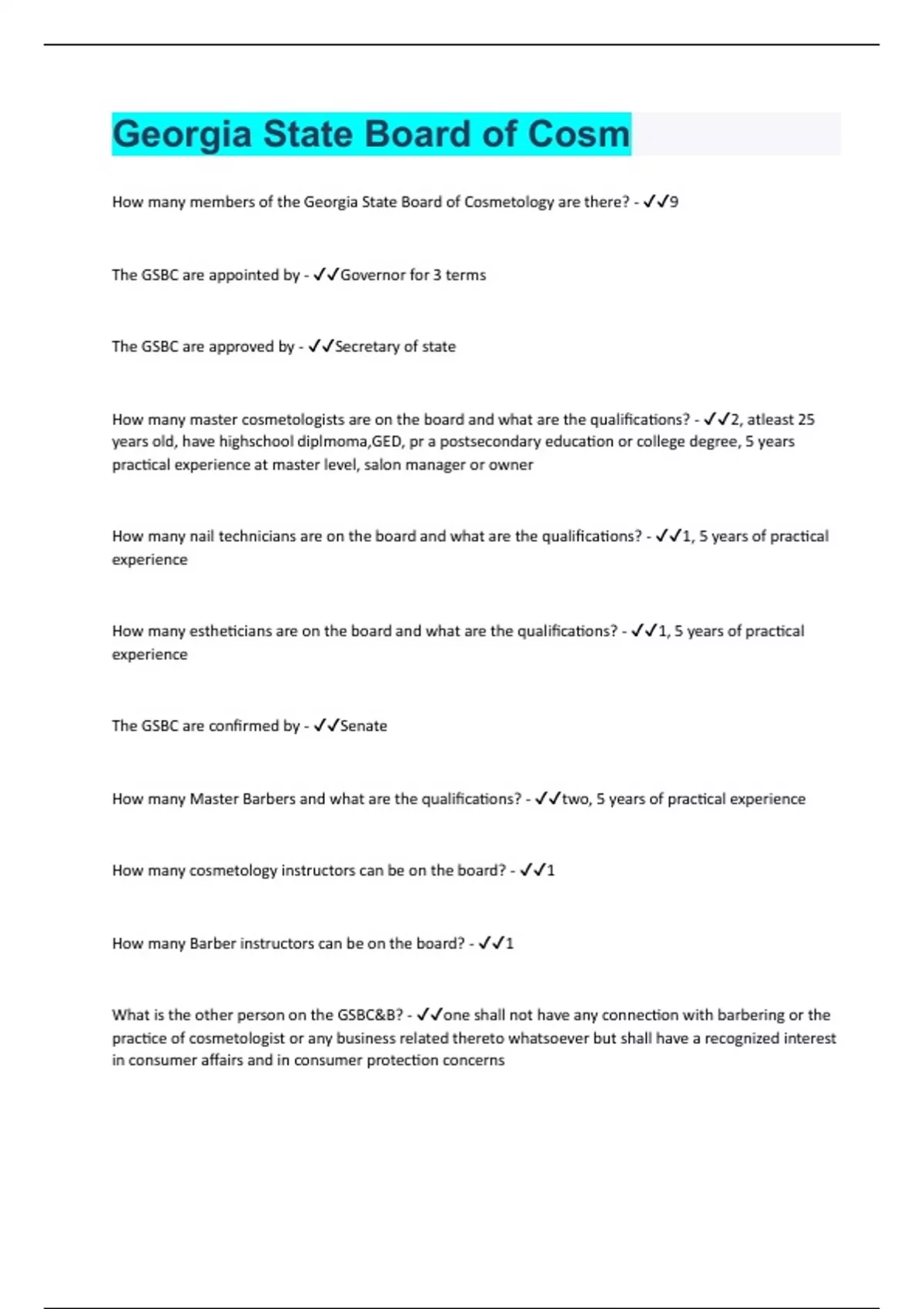 How many members of the Georgia State Board of Cosmetology are there? - 9 The GSBC are appointed by - Governor for 3 terms The GSBC are approved by - Secretary of state How many master cosmetologists are on the board and what are the qualifications? - 2, atleast 25 years old, have highschool diplmoma,GED, pr a postsecondary education or college degree, 5 years practical experience at master level, salon manager or owner How many nail technicians are on the board and what are the qualifications? - 1, 5 years of practical experience How many estheticians are on the board and what are the qualifications? - 1, 5 years of practical experience The GSBC are confirmed by - Senate How many Master Barbers and what are the qualifications? - two, 5 years of practical experience How many cosmetology instructors can be on the board? - 1 How many Barber instructors can be on the board? - 1 What is the other person on the GSBC&B? - one shall not have any connection with barbering or the practice of cosmetologist or any business related thereto whatsoever but shall have a recognized interest in consumer affairs and in consumer protection concerns