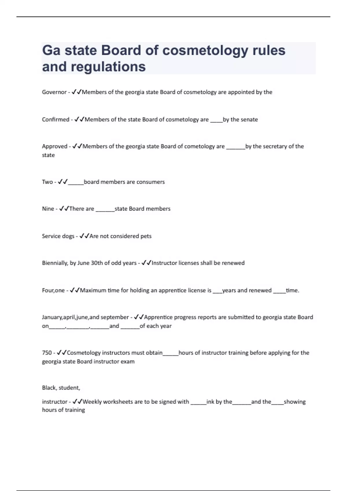 Governor - Members of the georgia state Board of cosmetology are appointed by the Confirmed - Members of the state Board of cosmetology are ____by the senate Approved - Members of the georgia state Board of cometology are ______by the secretary of the state Two - _____board members are consumers Nine - There are ______state Board members Service dogs - Are not considered pets Biennially, by June 30th of odd years - Instructor licenses shall be renewed Four,one - Maximum time for holding an apprentice license is ___years and renewed ____time. January,april,june,and september - Apprentice progress reports are submitted to georgia state Board on_____,_______,______and ______of each year 750 - Cosmetology instructors must obtain_____hours of instructor training before applying for the georgia state Board instructor exam Black, student, instructor - Weekly worksheets are to be signed with _____ink by the______and the____showing hours of training
