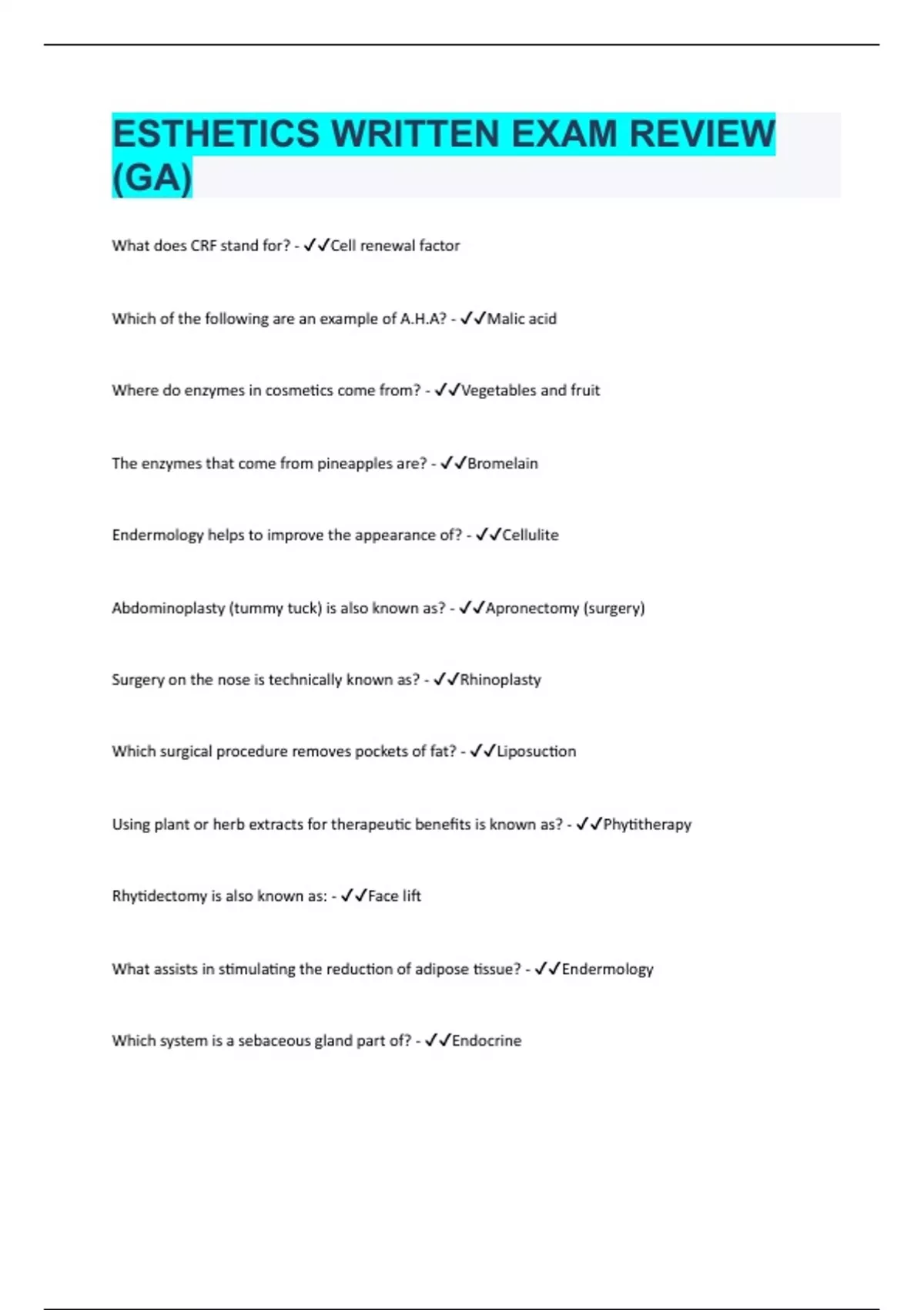 What does CRF stand for? - Cell renewal factor Which of the following are an example of A.H.A? - Malic acid Where do enzymes in cosmetics come from? - Vegetables and fruit The enzymes that come from pineapples are? - Bromelain Endermology helps to improve the appearance of? - Cellulite Abdominoplasty (tummy tuck) is also known as? - Apronectomy (surgery) Surgery on the nose is technically known as? - Rhinoplasty Which surgical procedure removes pockets of fat? - Liposuction Using plant or herb extracts for therapeutic benefits is known as? - Phytitherapy Rhytidectomy is also known as: - Face lift What assists in stimulating the reduction of adipose tissue? - Endermology Which system is a sebaceous gland part of? - Endocrine