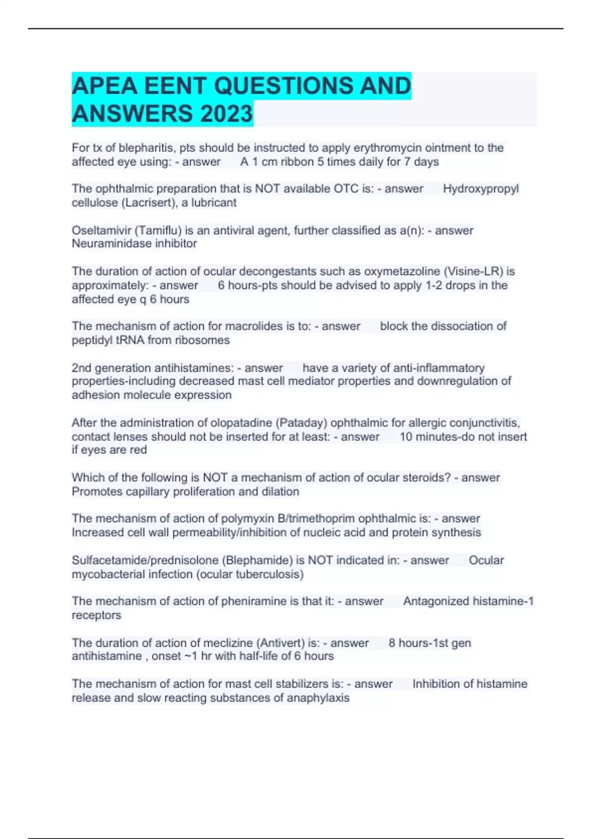 APEA EENT QUESTIONS AND ANSWERS 2023 For tx of blepharitis, pts should be instructed to apply erythromycin ointment to the affected eye using: A 1 cm ribbon 5 times daily for 7 days The ophthalmic preparation that is NOT available OTC is: Hydroxypropyl cellulose (Lacrisert), a lubricant Oseltamivir (Tamiflu) is an antiviral agent, further classified as a(n): Neuraminidase inhibitor The duration of action of ocular decongestants such as oxymetazoline (Visine-LR) is approximately: 6 hours-pts should be advised to apply 1-2 drops in the affected eye q 6 hours The mechanism of action for macrolides is to: block the dissociation of peptidyl tRNA from ribosomes 2nd generation antihistamines: have a variety of anti-inflammatory properties-including decreased mast cell mediator properties and downregulation of adhesion molecule expression After the administration of olopatadine (Pataday) ophthalmic for allergic conjunctivitis, contact lenses should not be inserted for at least: 10 minutes-do not insert if eyes are red Which of the following is NOT a mechanism of action of ocular steroids? Promotes capillary proliferation and dilation The mechanism of action of polymyxin B/trimethoprim ophthalmic is: Increased cell wall permeability/inhibition of nucleic acid and protein synthesis Sulfacetamide/prednisolone (Blephamide) is NOT indicated in: Ocular mycobacterial infection (ocular tuberculosis) The mechanism of action of pheniramine is that it: Antagonized histamine-1 receptors The duration of action of meclizine (Antivert) is: 8 hours-1st gen antihistamine , onset ~1 hr with half-life of 6 hours The mechanism of action for mast cell stabilizers is: Inhibition of histamine release and slow reacting substances of anaphylaxis The brand name for sulfacetamide ophthalmic is: Bleph-10 The vasoconstrictive properties of alpha- agonist medications make them beneficial for the tx of: Sinus congestion-used to reduce edema and inflammation within sinus cavities The generic name for Dramamine is: Dimehydrinate Which risk factor would NOT prohibit the NP from prescribing prednisolone acetate (Pred Forte)? Superficial punctate keratitis Which of the following organisms is NOT susceptible to sulfacetamide ophthalmic (Bleph-10)? Psuedomonas aeruginosa- does not provide adequate coverage against Neisseria species A medication that acts on the hypothalamus to produce antipyresis is: Acetaminophen Azelasine (Astelin), for tx of allergic rhinitis, is classified as a nasal: Antihistamine A serious adverse reaction to clindamycin (Cleocin) is: Clostridium difficile-related colitis If ocular steroids are to be used for more than 10 days, monitoring should include: Ocular pressure The most effective tx for eradication of group A streptococcus in those who are apparent carriers is: Oral clindamycin (Cleocin) for 10 days Oxymetazoline nasal spray, a nasal decongestant, is manufactured under the brand name: Afrin Which of the following is a cholinergic agonist used in the tx of glaucoma? Pilocarpine (Pilopine HS) ophthalmic A common side effect related to the administration of cetirizine (Zyrtec) is: Drowsiness-admin at bedtime The onset of action of oxymetazoline (Afrin) is: 1o minutes, 2-3 sprays in each nostril q 10-12 hours First-line tx for children who are diagnosed with Strep pharyngitis is: Amoxicillin (Amoxil) Brand names of sulfamethoxazole/trimethoprim do NOT include: Azulfidine (sulfasalazine) The duration of action of azelastine (Optivar) ophthalmic drops is: 8 hours Naphazoline/pheniramine (Naphcon-A) is indicated in the treatment of: Allergic conjunctivitis Ocular steroids indicated for the tx of allergic conjunctivitis can be used in pts with: Herpes zoster keratitis Polycin-B is the brand name for: Polymyxin B and bacitracin The brand name for meclizine is: Antivert Due to potential drug-drug interactions, therapy should be monitored when a pt is receiving erythromycin (Eyemycin) ointment and: Warfarin-may increase serum concentration of Vit K antagonists such as warfarin Due to the potential development of pseudo tumor cerebri, tetracycline (Sumycin) should not be administered concomitantly with: Isotretinoin (Claravis)-may enhance the adverse/toxic effect of retinoic acid derivatives A benefit of prescribing an ophthalmic antihistamine with mast cell stabilizer property would be that the mast cell stabilizer provides: An extended duration of action-due to their high affinity to the H-1 receptor Ocular decongestants such as oxymetazoline (Visine-LR) are used to reduce: Redness Pts should be advised to administer polymyxin B/trimethoprim q: 3 hours, maximum 6 doses in 24 hour period The most common symptoms of penicillin allergy includes hives, itchy eyes, and: Swollen lips Bacitracin (Ocu-tracin) ophthalmic ointment inhibits bacterial cell wall synthesis by: Preventing the transfer of mucopeptides into the growing cell wall When prescribing polymyxin B sulfate/bacitracin zinc (Polycin-B), pts should be instructed to: Complete therapy, even if sx resolve Prolonged use of bacitracin ophthalmic may result in: Fungal overgrowth Which of the following is classified as a 2nd gen antihistamine? Fexofenadine (Allegra) Hydroxyzine-1st gen Pts being treated with trifluridine (Viroptic) for herpes simplex 1 keratoconjunctivitis should be advised to return to the clinic if they do not experience sx improvement within: 7 days Polymyxin B/trimethoprim ophthalmic is NOT indicated for: Ophthalmia neonatorum-does not treat the most common bacterial causes The mechanism of action of trifluridine (Viroptic), an ophthalmic antiviral, used the treatment of herpes simplex conjunctivitis is: Interference with viral replication by inhibiting thymidylate synthetase A common side effect of oral phenylephrine (Sudafed), a decongestant is: Anxiety Cephalosporins are classified as: Beta-lactam antibiotics Ophthalmic cromolyn inhibits the degranulation of sensitized mast cells. It is indicated in the treatment of: Vernal conjunctivitis