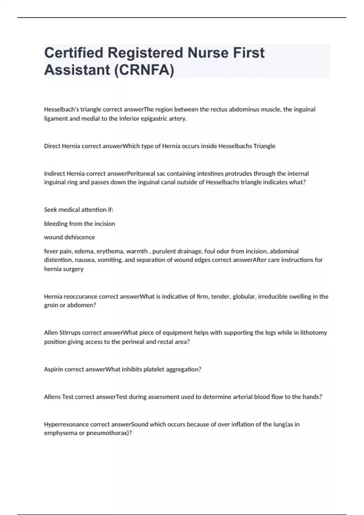 Hesselbach's triangle The region between the rectus abdominus muscle, the inguinal ligament and medial to the inferior epigastric artery. Direct Hernia Which type of Hernia occurs inside Hesselbachs Triangle Indirect Hernia Peritoneal sac containing intestines protrudes through the internal inguinal ring and passes down the inguinal canal outside of Hesselbachs triangle indicates what? Seek medical attention if: bleeding from the incision wound dehiscence fever pain, edema, erythema, warmth , purulent drainage, foul odor from incision, abdominal distention, nausea, vomiting, and separation of wound edges After care instructions for hernia surgery Hernia reoccurance What is indicative of firm, tender, globular, irreducible swelling in the groin or abdomen? Allen Stirrups What piece of equipment helps with supporting the legs while in lithotomy position giving access to the perineal and rectal area? Aspirin What inhibits platelet aggregation? Allens Test Test during assessment used to determine arterial blood flow to the hands? Hyperresonance Sound which occurs because of over inflation of the lung(as in emphysema or pneumothorax)? In order: Inspection Auscultation Palpation Percussion Assessment of the abdomen includes? Serratus anterior nerve thoracodorsal nerve While doing an axillary dissection be aware of? To create enough space to prevent compression of vessels and nerves in the brachial plexus Why is an axillary roll used during lateral positioning? Common Peroneal Nerve Distal fibula What are you protecting by placing padding at the lateral aspect to the bottom knee and ankle? Palm up, To protect ulnar nerve During lateral positioning what position is the lower arm in and why? Pin prick to pinky (3rd,4th,5th fingers affected with ulnar nerve injury) Used to diagnose injury to ulnar nerve Monofilament What type of suture is used in vascular procedures? 11-13.5 seconds Normal PT 0.8-1.1 Normal INR