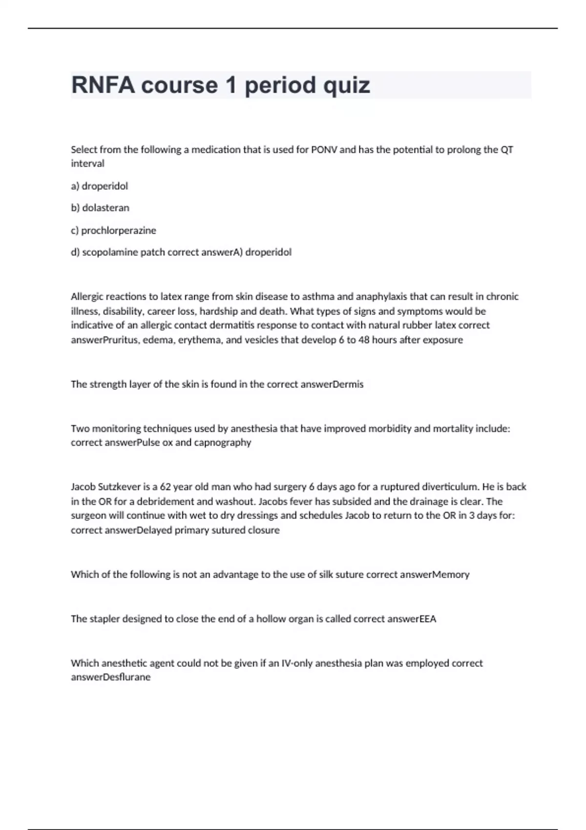 Select from the following a medication that is used for PONV and has the potential to prolong the QT interval a) droperidol b) dolasteran c) prochlorperazine d) scopolamine patch A) droperidol Allergic reactions to latex range from skin disease to asthma and anaphylaxis that can result in chronic illness, disability, career loss, hardship and death. What types of signs and symptoms would be indicative of an allergic contact dermatitis response to contact with natural rubber latex Pruritus, edema, erythema, and vesicles that develop 6 to 48 hours after exposure The strength layer of the skin is found in the Dermis Two monitoring techniques used by anesthesia that have improved morbidity and mortality include: Pulse ox and capnography Jacob Sutzkever is a 62 year old man who had surgery 6 days ago for a ruptured diverticulum. He is back in the OR for a debridement and washout. Jacobs fever has subsided and the drainage is clear. The surgeon will continue with wet to dry dressings and schedules Jacob to return to the OR in 3 days for: Delayed primary sutured closure Which of the following is not an advantage to the use of silk suture Memory The stapler designed to close the end of a hollow organ is called EEA Which anesthetic agent could not be given if an IV-only anesthesia plan was employed Desflurane The process of decontamination should initially begin at what point? Completion of the surgical procedure Which statement about surgical dressings is true A) surgical dressing maintain tension on the suture line to prevent dehiscence B) surgical dressings cushion and protect the wound from trauma and gross contamination and absorb drainage C) surgical dressings protect surrounding drapes, linen and clothing from contamination D) surgical dressings cover the wound to maintain moisture to promote granulation B) surgical dressings cushion and protect the wound from trauma and gross contamination and absorb drainage