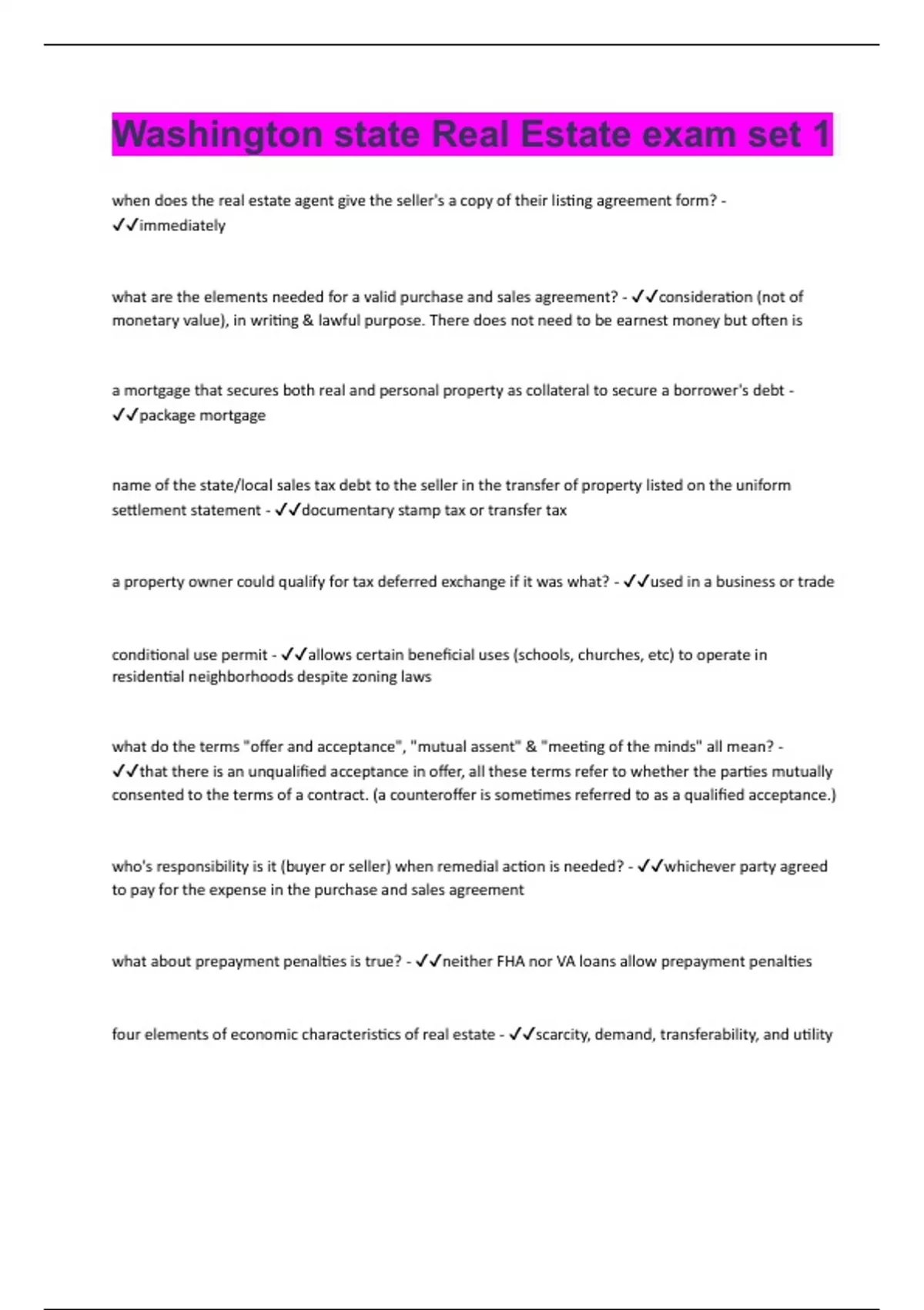 Washington state Real Estate exam set 1| Questions with 100% Correct Answers | Verified
