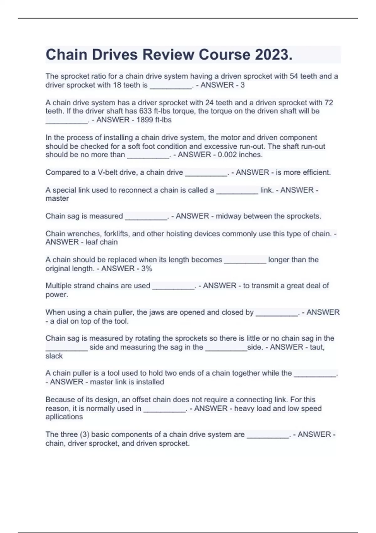 Chain Drives Review Course 2023.The sprocket ratio for a chain drive system having a driven sprocket with 54 teeth and a driver sprocket with 18 teeth is __________. - ANSWER - 3 A chain drive system has a driver sprocket with 24 teeth and a driven sprocket with 72 teeth. If the driver shaft has 633 ft-lbs torque, the torque on the driven shaft will be __________. - ANSWER - 1899 ft-lbs In the process of installing a chain drive system, the motor and driven component should be checked for a soft foot condition and excessive run-out. The shaft run-out should be no more than __________. - ANSWER - 0.002 inches. Compared to a V-belt drive, a chain drive __________. - ANSWER - is more efficient. A special link used to reconnect a chain is called a __________ link. - ANSWER - master Chain sag is measured __________. - ANSWER - midway between the sprockets. Chain wrenches, forklifts, and other hoisting devices commonly use this type of chain. - ANSWER - leaf chain A chain should be replaced when its length becomes __________ longer than the original length. - ANSWER - 3% Multiple strand chains are used __________. - ANSWER - to transmit a great deal of power. When using a chain puller, the jaws are opened and closed by __________. - ANSWER - a dial on top of the tool. Chain sag is measured by rotating the sprockets so there is little or no chain sag in the __________ side and measuring the sag in the __________side. - ANSWER - taut, slack