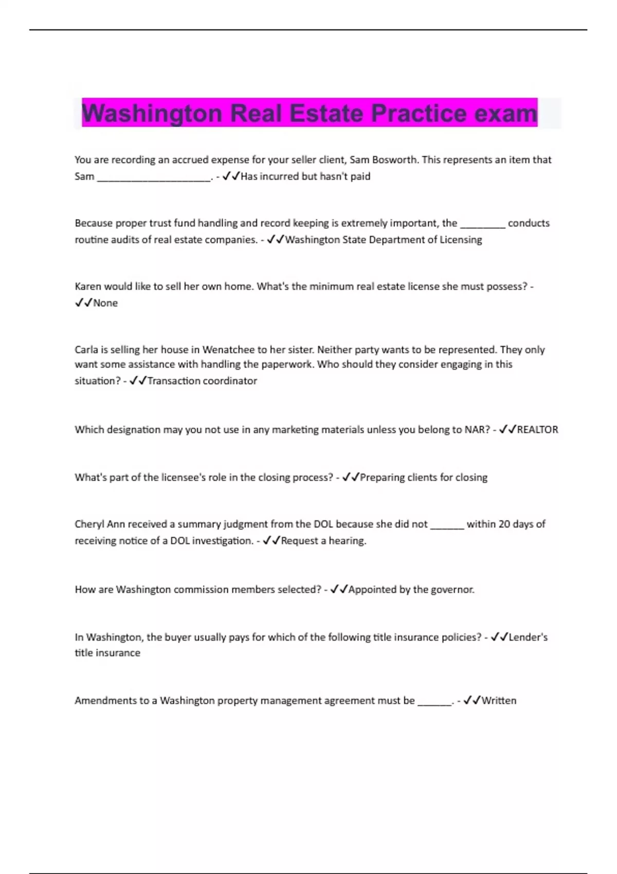 You are recording an accrued expense for your seller client, Sam Bosworth. This represents an item that Sam ____________________. - Has incurred but hasn't paid Because proper trust fund handling and record keeping is extremely important, the ________ conducts routine audits of real estate companies. - Washington State Department of Licensing Karen would like to sell her own home. What's the minimum real estate license she must possess? - None Carla is selling her house in Wenatchee to her sister. Neither party wants to be represented. They only want some assistance with handling the paperwork. Who should they consider engaging in this situation? - Transaction coordinator Which designation may you not use in any marketing materials unless you belong to NAR? - REALTOR What's part of the licensee's role in the closing process? - Preparing clients for closing Cheryl Ann received a summary judgment from the DOL because she did not ______ within 20 days of receiving notice of a DOL investigation. - Request a hearing. How are Washington commission members selected? - Appointed by the governor. In Washington, the buyer usually pays for which of the following title insurance policies? - Lender's title insurance Amendments to a Washington property management agreement must be ______. - Written