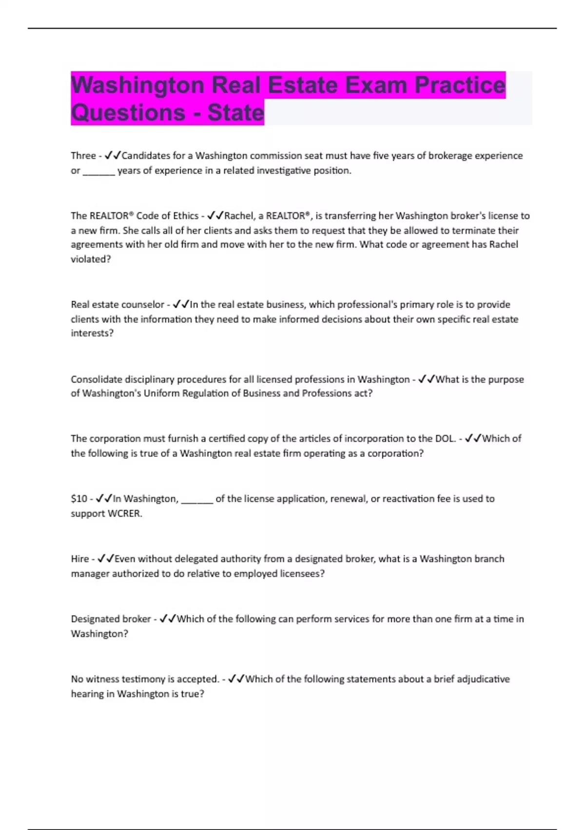 Washington Real Estate Exam Practice | Questions with 100% Correct Answers | Verified