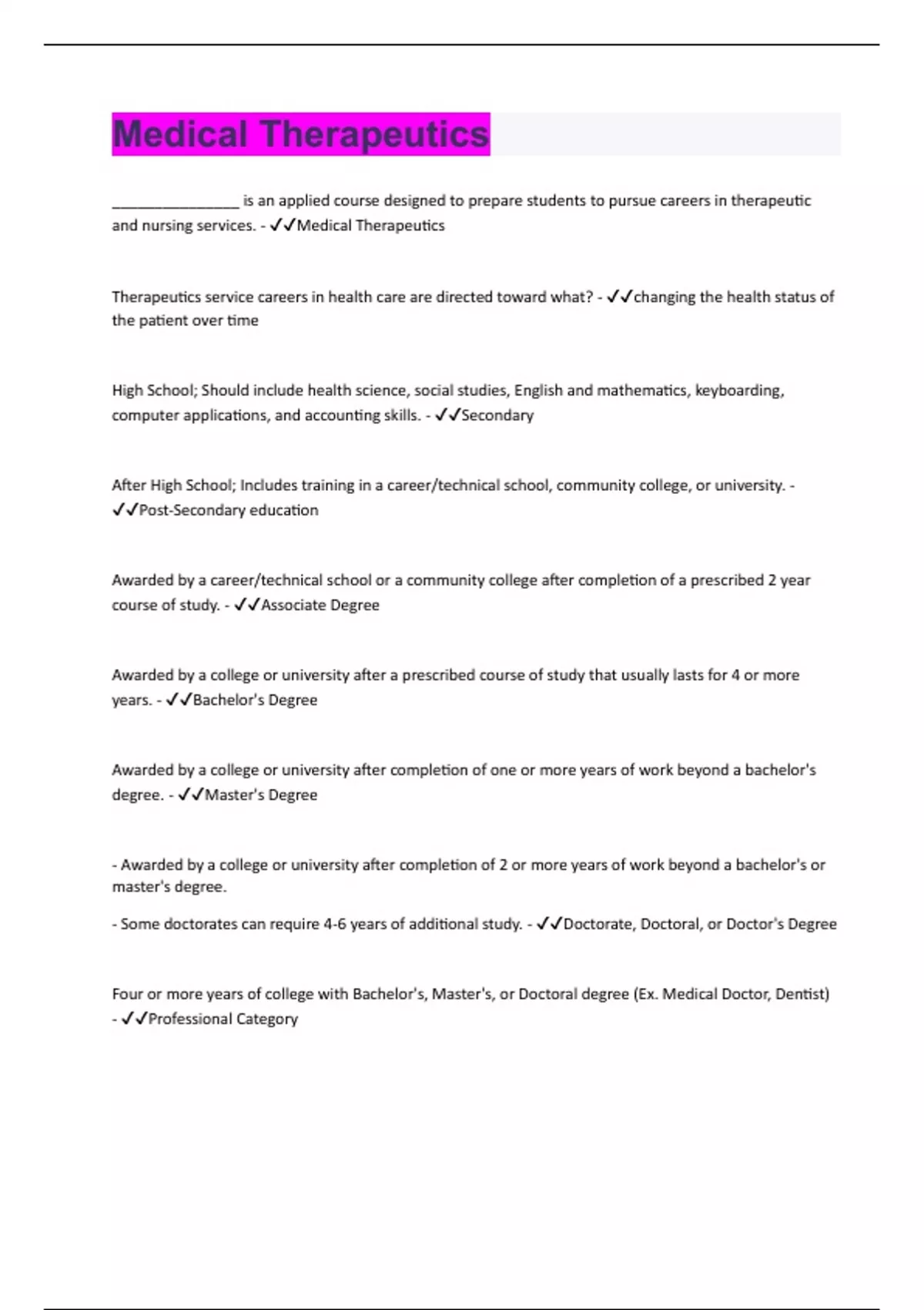 _______________ is an applied course designed to prepare students to pursue careers in therapeutic and nursing services. - Medical Therapeutics Therapeutics service careers in health care are directed toward what? - changing the health status of the patient over time High School; Should include health science, social studies, English and mathematics, keyboarding, computer applications, and accounting skills. - Secondary After High School; Includes training in a career/technical school, community college, or university. - Post-Secondary education Awarded by a career/technical school or a community college after completion of a prescribed 2 year course of study. - Associate Degree Awarded by a college or university after a prescribed course of study that usually lasts for 4 or more years. - Bachelor's Degree Awarded by a college or university after completion of one or more years of work beyond a bachelor's degree. - Master's Degree - Awarded by a college or university after completion of 2 or more years of work beyond a bachelor's or master's degree. - Some doctorates can require 4-6 years of additional study. - Doctorate, Doctoral, or Doctor's Degree Four or more years of college with Bachelor's, Master's, or Doctoral degree (Ex. Medical Doctor, Dentist) - Professional Category