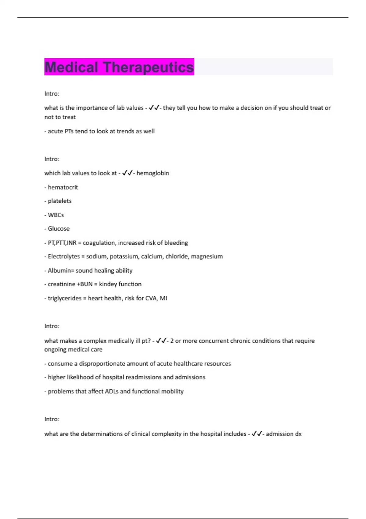 Intro: what is the importance of lab values - - they tell you how to make a decision on if you should treat or not to treat - acute PTs tend to look at trends as well Intro: which lab values to look at - - hemoglobin - hematocrit - platelets - WBCs - Glucose - PT,PTT,INR = coagulation, increased risk of bleeding - Electrolytes = sodium, potassium, calcium, chloride, magnesium - Albumin= sound healing ability - creatinine +BUN = kindey function - triglycerides = heart health, risk for CVA, MI Intro: what makes a complex medically ill pt? - - 2 or more concurrent chronic conditions that require ongoing medical care - consume a disproportionate amount of acute healthcare resources - higher likelihood of hospital readmissions and admissions - problems that affect ADLs and functional mobility Intro: what are the determinations of clinical complexity in the hospital includes - - admission dx