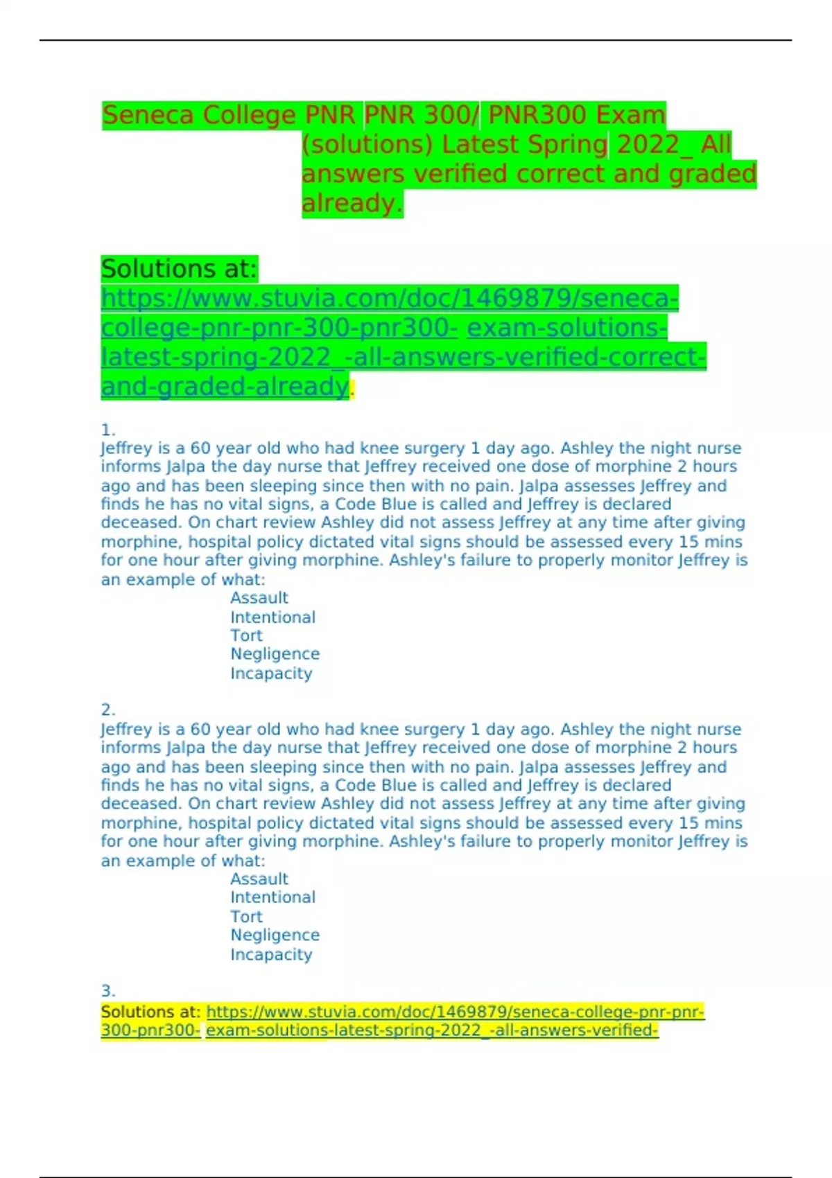 PNR 300 Seneca College; PNR/ PNR 300 Final Exam Solutions 2.Jeffrey is a 60 year old who had knee surgery 1 day ago. Ashley the night nurse informs Jalpa the day nurse that Jeffrey received one dose of morphine 2 hours ago and has been sleeping since then with no pain. Jalpa assesses Jeffrey and finds he has no vital signs, a Code Blue is called and Jeffrey is declared deceased. On chart review Ashley did not assess Jeffrey at any time after giving morphine, hospital policy dictated vital signs should be assessed every 15 mins for one hour after giving morphine. Ashley's failure to properly monitor Jeffrey is an example of what: Assault Intentional Tort Negligence Incapacity 3.Documentation is used to communicate to all members of the health care team and to monitor client status and progress. All of the following are examples how nurses demonstrate this standard except? Ensuring timely, complete and accurate record of care provided Documenting both objective and subjective data accurately Using abbreviations appropriately Ensuring documentation is made in a temporary format or record 4. Riley, a 12-year-old boy with leukemia, has been undergoing treatment for the last two years. When asked about his disease, Riley is able to articulate the details of his illness and treatment. For the last six months, Riley's condition has deteriorated, and he has been admitted to the hospital several times. Riley has expressed desire to discontinue his treatment and says