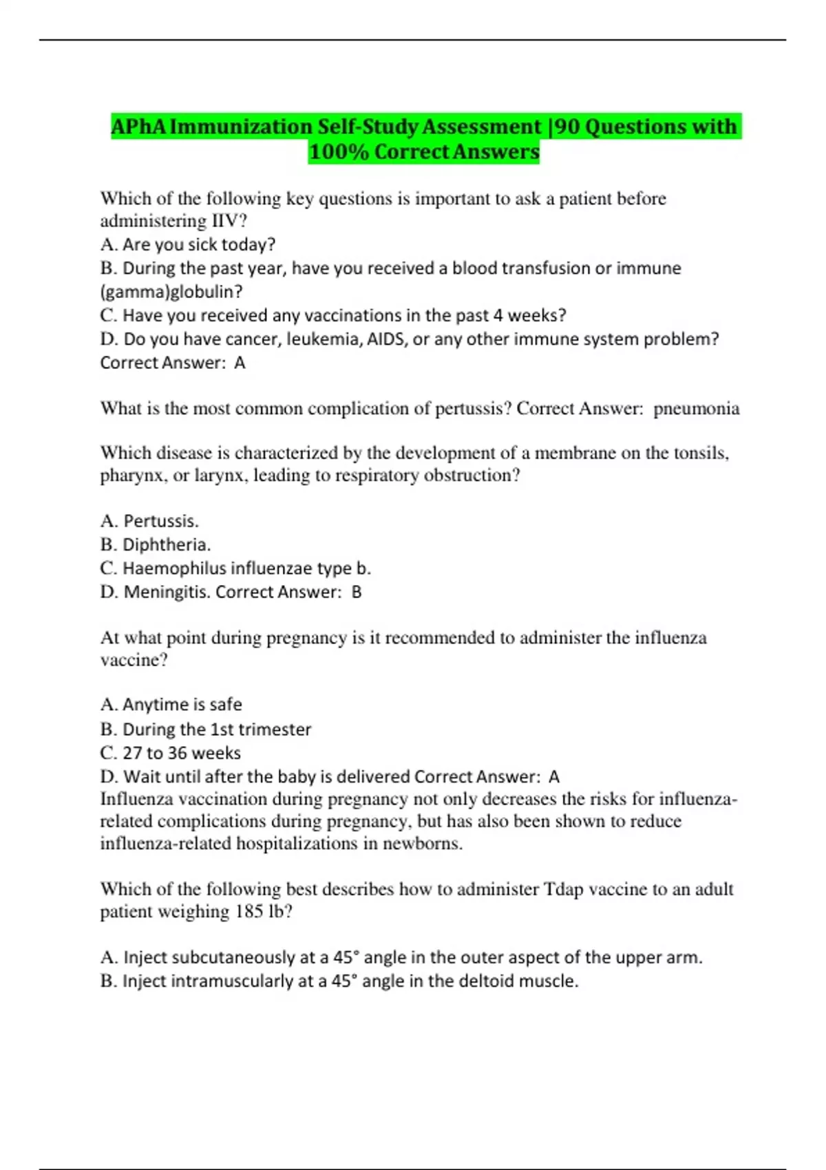 APhA Immunization Self-Study Assessment | 90 Questions with 100% Correct Answers/APhA Immunization Self-Study Assessment | 90 Questions with 100% Correct Answers/APhA Immunization Self-Study Assessment | 90 Questions with 100% Correct Answers
