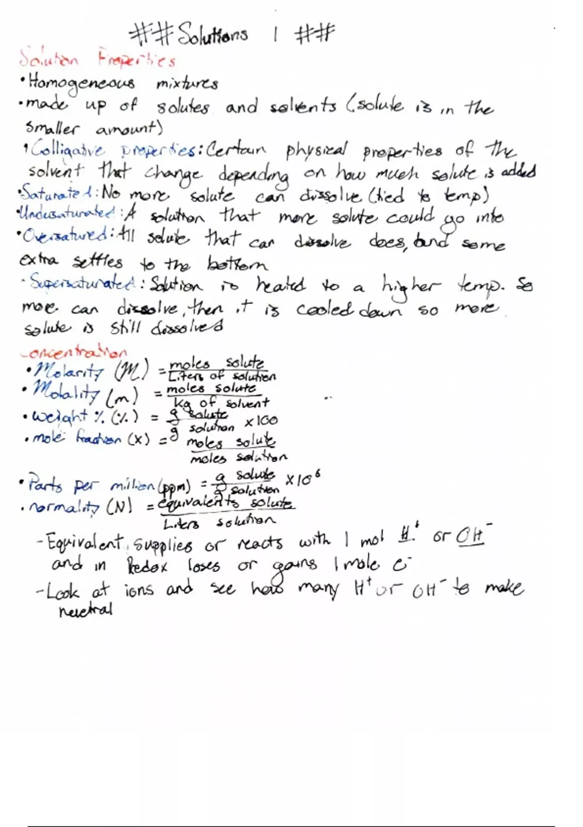 Notes taken on the topic of solutions as taught by Dr. Williamson in CHEM 120 at TAMU. Covers topics such as the solubility of solutions and definitions of what a solution is, including solvent versus solute definitions. Also contains various ways to measure concentration and their corresponding formulas (molarity, molality, weight %, mole fraction, etc.). Deals with colligative properties, vapor pressure, boiling point, freezing point, osmotic pressure, and their corresponding calculations and examples.