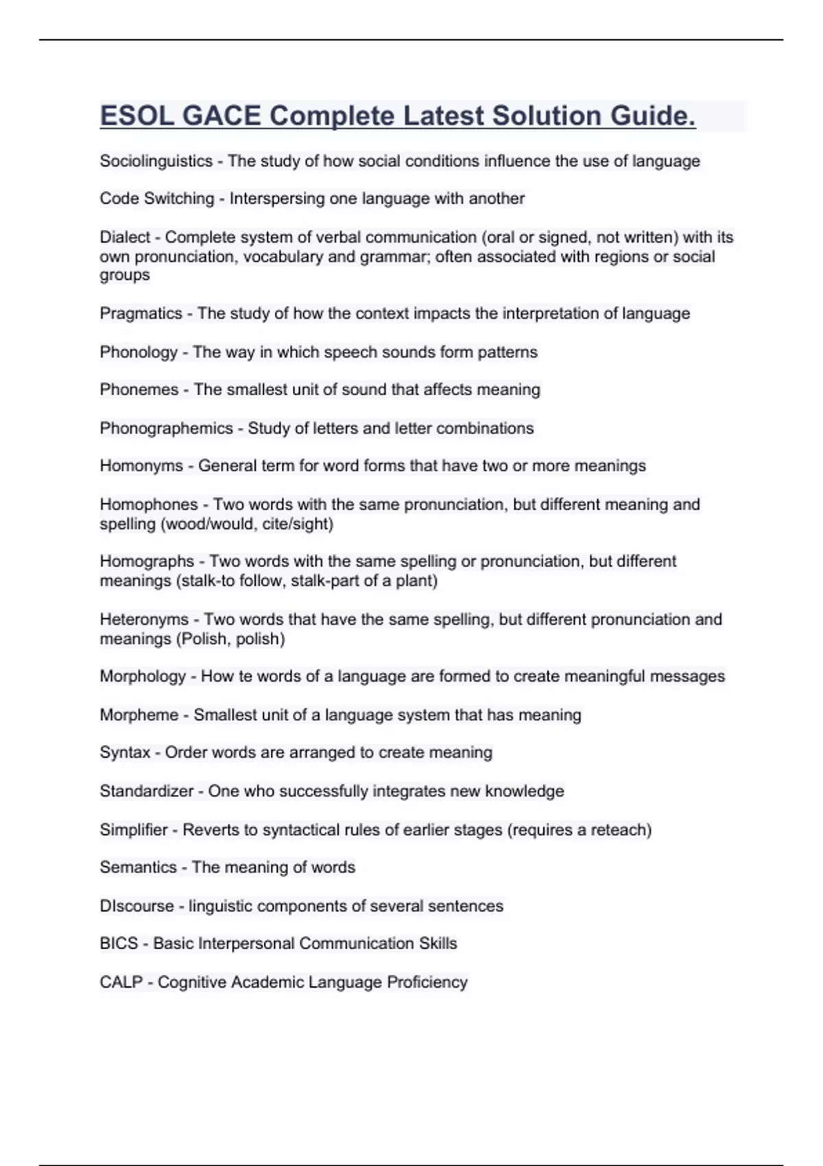 Summary ESOL GACE Complete Latest Solution Guide.