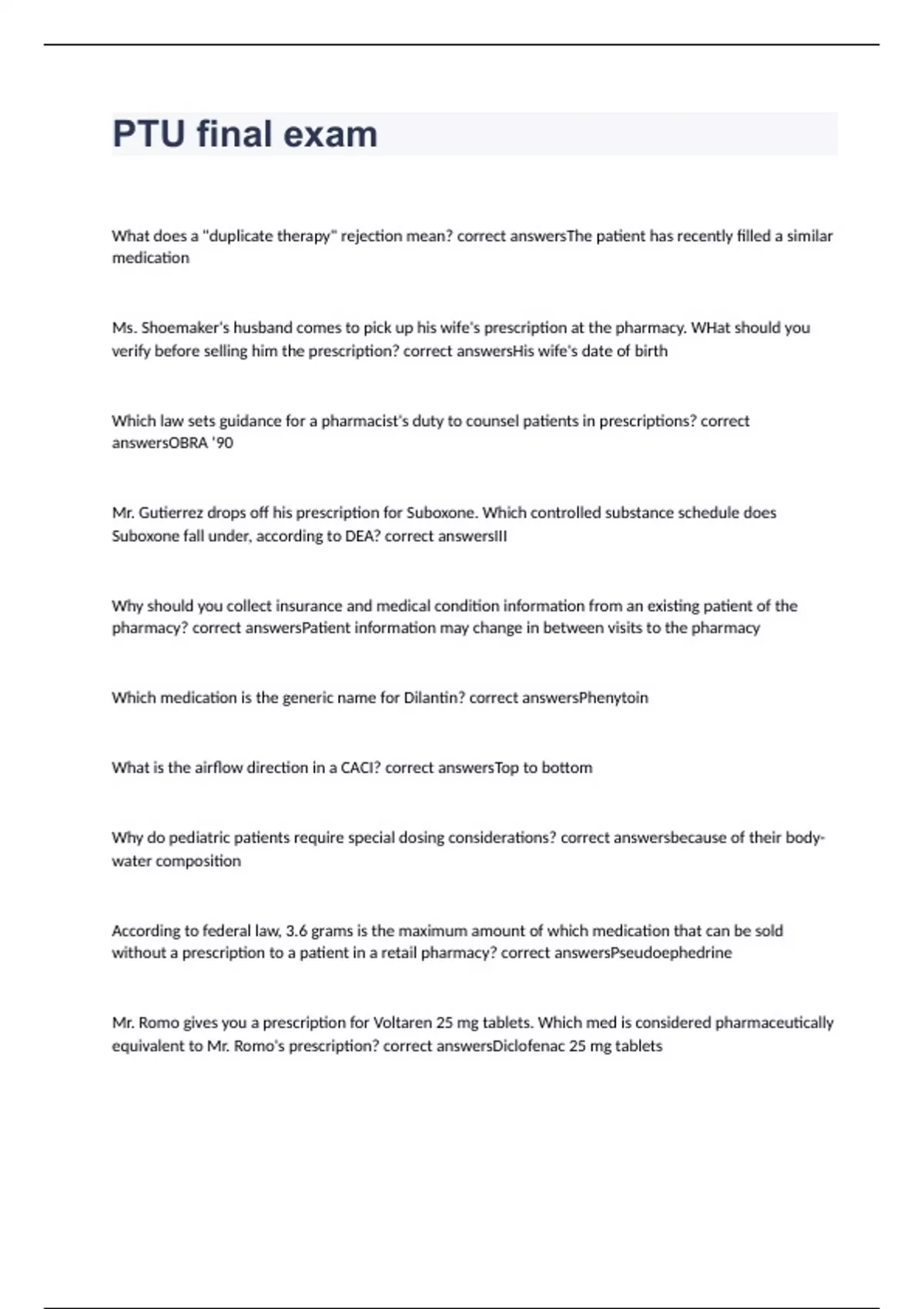 What does a "duplicate therapy" rejection mean? The patient has recently filled a similar medication Ms. Shoemaker's husband comes to pick up his wife's prescription at the pharmacy. WHat should you verify before selling him the prescription? His wife's date of birth Which law sets guidance for a pharmacist's duty to counsel patients in prescriptions? OBRA '90 Mr. Gutierrez drops off his prescription for Suboxone. Which controlled substance schedule does Suboxone fall under, according to DEA? III Why should you collect insurance and medical condition information from an existing patient of the pharmacy? Patient information may change in between visits to the pharmacy Which medication is the generic name for Dilantin? Phenytoin What is the airflow direction in a CACI? Top to bottom Why do pediatric patients require special dosing considerations? because of their body-water composition According to federal law, 3.6 grams is the maximum amount of which medication that can be sold without a prescription to a patient in a retail pharmacy? Pseudoephedrine Mr. Romo gives you a prescription for Voltaren 25 mg tablets. Which med is considered pharmaceutically equivalent to Mr. Romo's prescription? Diclofenac 25 mg tablets