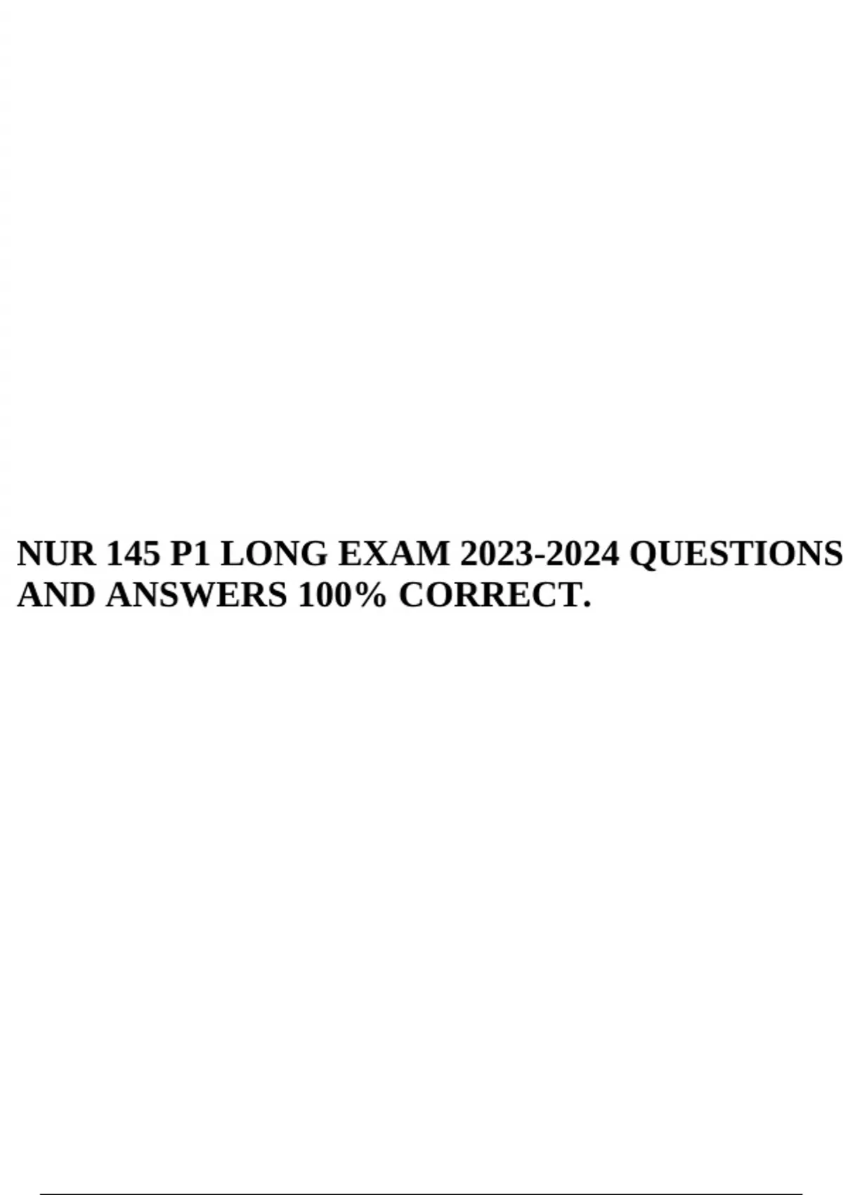 NUR 145 P1 LONG EXAM QUESTIONS AND ANSWERS 100% CORRECT. NUR 145 P1 LONG EXAM Total points 48/50 This is a 50 items multiple choice questions. Read the statement and select the best answer. You are given 45 minutes to answer. Please give me a message if you have concerns. Good luck! A woman delivers a 3,250 g neonate at 42 weeks’ gestation. Which physical finding is expected during an examination of this neonate? * A nurse is providing instructions to a mother who has been diagnosed with mastitis. Which of the following statements if made by the mother indicates a need for further teaching? * 2/18/2021 NUR 145 P1 LONG EXAM B. “I can use analgesics to assist in alleviating some of the discomfort.” C. “I need to wear a supportive bra to relieve the discomfort.” D. “I need to stop breastfeeding until this condition resolves.” 1/1 A. Keep the patent ductus arteriosus (PDA) open B. Reduce joint inflammation C. Decrease swelling of strawberry tongue D. Treat ventricular hypertrophy of endocarditis. 1/1 A. If the patient was A+ she would need to receive RhoGAM. B. The patient will need to receive RhoGAM during this visit to prevent hemolytic disease of the newborn. C. The baby will need to receive RhoGAM after it’s born. D. Since the mother is A- the baby can be Rh positive, which could lead to an immune attack on the mother’s body. Option 1 Aspirin has been ordered for the child with rheumatic fever (RF) in order to: * A 26 year old female is 27 weeks pregnant with her second child. The woman is A-. As the nurse you know that: * 2/18/2021 NUR 145 P1 LONG EXAM 1/1 A. Disuse syndrome B. Infection C. Fluid volume deficit D. Decreased cardiac output 1/1 A. Severe anemia leading to electrolyte, metabolic, and nutritional imbalances in the absence of other medical problems. B. Severe nausea and vomiting leading to electrolyte, metabolic, and nutritional imbalances in the absence of other medical problems. C. Loss of appetite and continuous vomiting that commonly results in dehydration and ultimately decreasing maternal nutrients D. Severe nausea and diarrhea that can cause gastrointestinal irritation and possibly internal bleeding.