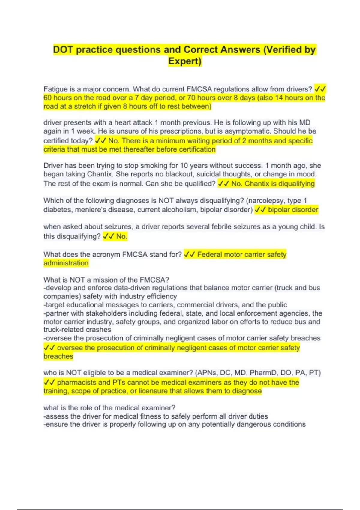 DOT practice questions and Correct Answers (Verified by Expert). Fatigue is a major concern. What do current FMCSA regulations allow from drivers? 60 hours on the road over a 7 day period, or 70 hours over 8 days (also 14 hours on the road at a stretch if given 8 hours off to rest between) driver presents with a heart attack 1 month previous. He is following up with his MD again in 1 week. He is unsure of his prescriptions, but is asymptomatic. Should he be certified today? No. There is a minimum waiting period of 2 months and specific criteria that must be met thereafter before certification Driver has been trying to stop smoking for 10 years without success. 1 month ago, she began taking Chantix. She reports no blackout, suicidal thoughts, or change in mood. The rest of the exam is normal. Can she be qualified? No. Chantix is diqualifying Which of the following diagnoses is NOT always disqualifying? (narcolepsy, type 1 diabetes, meniere's disease, current alcoholism, bipolar disorder) bipolar disorder when asked about seizures, a driver reports several febrile seizures as a young child. Is this disqualifying? No. What does the acronym FMCSA stand for? Federal motor carrier safety administration What is NOT a mission of the FMCSA? -develop and enforce data-driven regulations that balance motor carrier (truck and bus companies) safety with industry efficiency -target educational messages to carriers, commercial drivers, and the public -partner with stakeholders including federal, state, and local enforcement agencies, the motor carrier industry, safety groups, and organized labor on efforts to reduce bus and truck-related crashes -oversee the prosecution of criminally negligent cases of motor carrier safety breaches oversee the prosecution of criminally negligent cases of motor carrier safety breaches who is NOT eligible to be a medical examiner? (APNs, DC, MD, PharmD, DO, PA, PT) pharmacists and PTs cannot be medical examiners as they do not have the training, scope of practice, or licensure that allows them to diagnose what is the role of the medical examiner? -assess the driver for medical fitness to safely perform all driver duties -ensure the driver is properly following up on any potentially dangerous conditions -treat the driver for health conditions -council the driver on health conditions and consequences -diagnose new health concerns of the driver -assess the driver for medical fitness to safely perform all driver duties -ensure the driver is properly following up on any potentially dangerous conditions -council the driver on health conditions and consequences what is ensured as a part of the NRCME's medical oversight mission? -individuals performing medical examinations are qualified to do so and are educated about occupational issues for drivers -a tracking mechanism that ensures that every prior application by an individual for medical certification is recorded and reviewed -medical certification regulations are updated periodically -a review process that prevents or identifies and corrects the inappropriate issuance of medical certification -all of the above all of the above according to the DOT, the AVERAGE driver falls into all of these categories, EXCEPT: (male, between 25 and 39 years of age, sedentary, overweight, smoker, poor eating habits, less healthy than the average person, more than 2 medical conditions, cardiovascular disease prevalent) between 25 and 39 years of age- the average driver is more than 40 years of age what of these abilities is NOT required of a driver to safely perform his/her duties? -perceptual skills to monitor sometimes complex driving situations -judgment skills to make quick decisions when necessary -manipulative/manual skills to control his vehicle -social sills to act kindly to interpersonal activities on the road social sills to act kindly to interpersonal activities on the road- mental and physical abilities are required (social skills are not unless their absence indicates mental illness) fatigue is a major concern. what do current FMCSA regulations allow from drivers? 60 hours on the road over a 7 day period, or 70 hours over 8 days the motor carrier is required to make sure drivers meet certain requirements. EXCEPT which of the following, the driver must: -be at least 21 years old -speak and read English well enough to understand highway/traffic signals and converse -have a current medical examiner's certificate on file -provide their full medical examiner's report (long form) to the motor carrier -have provided the motor carrier with required background and violations information -have successfully completed a driver's road test or equivalent provide their full medical examiner's report (long form) to the motor carrier.