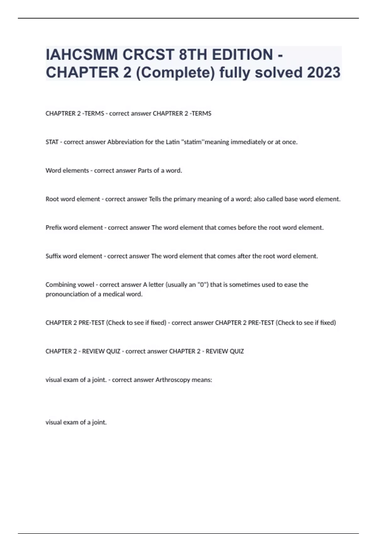 IAHCSMM CRCST 8TH EDITION - CHAPTER 2 (Complete) fully solved 2023CHAPTRER 2 -TERMS - correct answer CHAPTRER 2 -TERMS STAT - correct answer Abbreviation for the Latin "statim''meaning immediately or at once. Word elements - correct answer Parts of a word. Root word element - correct answer Tells the primary meaning of a word; also called base word element. Prefix word element - correct answer The word element that comes before the root word element. Suffix word element - correct answer The word element that comes after the root word element. Combining vowel - correct answer A letter (usually an "0") that is sometimes used to ease the pronounciation of a medical word. CHAPTER 2 PRE-TEST (Check to see if fixed) - correct answer CHAPTER 2 PRE-TEST (Check to see if fixed) CHAPTER 2 - REVIEW QUIZ - correct answer CHAPTER 2 - REVIEW QUIZ visual exam of a joint. - correct answer Arthroscopy means: visual exam of a joint.