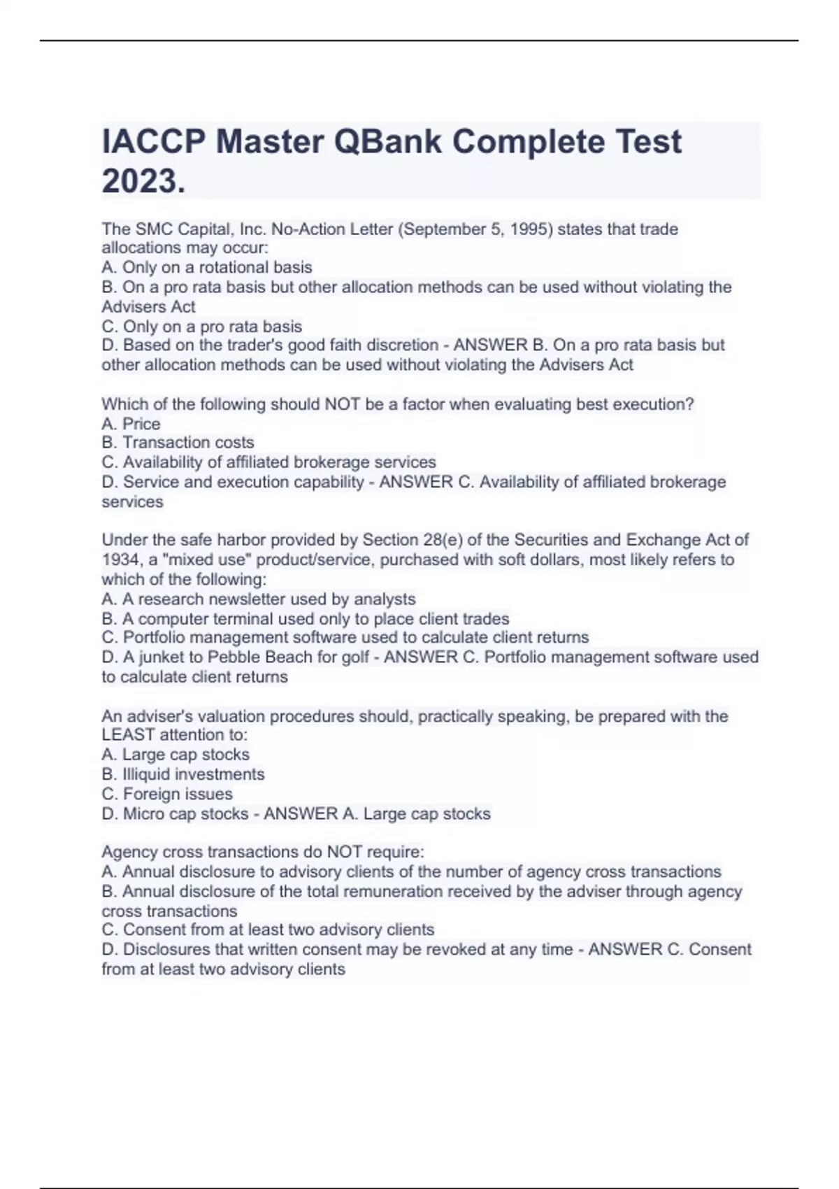 IACCP Master QBank Complete Test 2023.The SMC Capital, Inc. No-Action Letter (September 5, 1995) states that trade allocations may occur: A. Only on a rotational basis B. On a pro rata basis but other allocation methods can be used without violating the Advisers Act C. Only on a pro rata basis D. Based on the trader's good faith discretion - ANSWER B. On a pro rata basis but other allocation methods can be used without violating the Advisers Act Which of the following should NOT be a factor when evaluating best execution? A. Price B. Transaction costs C. Availability of affiliated brokerage services D. Service and execution capability - ANSWER C. Availability of affiliated brokerage services Under the safe harbor provided by Section 28(e) of the Securities and Exchange Act of 1934, a "mixed use" product/service, purchased with soft dollars, most likely refers to which of the following: A. A research newsletter used by analysts B. A computer terminal used only to place client trades C. Portfolio management software used to calculate client returns D. A junket to Pebble Beach for golf - ANSWER C. Portfolio management software used to calculate client returns An adviser's valuation procedures should, practically speaking, be prepared with the LEAST attention to: A. Large cap stocks B. Illiquid investments C. Foreign issues D. Micro cap stocks - ANSWER A. Large cap stocks Agency cross transactions do NOT require: A. Annual disclosure to advisory clients of the number of agency cross transactions B. Annual disclosure of the total remuneration received by the adviser through agency cross transactions C. Consent from at least two advisory clients D. Disclosures that written consent may be revoked at any time - ANSWER C. Consent from at least two advisory clients "Bailey disclosure" refers to the concept of advising clients of the effect of directing the adviser to use a particular broker(s). Disclosure about the ramifications of brokerage direction should include: A. Potential conflicts of interest when a directed broker referred the client to the adviser B. Limits on the ability of the adviser to negotiate commissions C. Restrictions on placing directed trades with other client trades D. All of the above - ANSWER D. All of the above Which of the following statements is FALSE? A. Trade errors must be resolved for the client's benefit. B. Principal transactions require consent prior to settlement. C. Commissions generated from ERISA plan transactions may never be used to generate soft dollars. D. An adviser's fiduciary duty includes allocating investment opportunities fairly and equitably. - ANSWER C. Commissions generated from ERISA plan transactions may never be used to generate soft dollars. A client directs an adviser to execute securities transactions with ABC Broker. What are adviser's obligation(s) in trading for this client? A. To consider ABC Broker when conducting client's transactions B. To execute all of client's transactions with ABC Broker C. To execute some of client's transactions with ABC Broker regardless of best execution D. To execute all of client's transactions with ABC Broker, consistent with the adviser's duty to achieve best execution - ANSWER B. To execute all of client's transactions with ABC Broker Some of adviser's clients have directed that certain brokers be used to trade for their accounts. When executing similar transactions for non-directed and directed business, the adviser should: A. Ensure its order of transactions is consistent with its disclosure B. Promise to receive equal execution for non-directed and directed business C. Always execute directed transactions first D. Consider which client's accounts need improved performance - ANSWER A. ensure its order of transactions is consistent with its disclosure Which of the following statements is FALSE? A. In a soft dollar arrangement, an adviser always receives research services produced by a third party whom the broker-dealer pays. B. Soft dollar arrangements that fail to comply with the Section 28(e) safe harbor are not prohibited under the Investment Advisers Act of 1940. C. Riskless principal transactions may be used to generate soft dollar commissions. D. Soft dollars may not be used to correct trade errors in client accounts. - ANSWER A. In a soft dollar arrangement, an adviser always receives research services produced by a third party whom the broker-dealer pays.