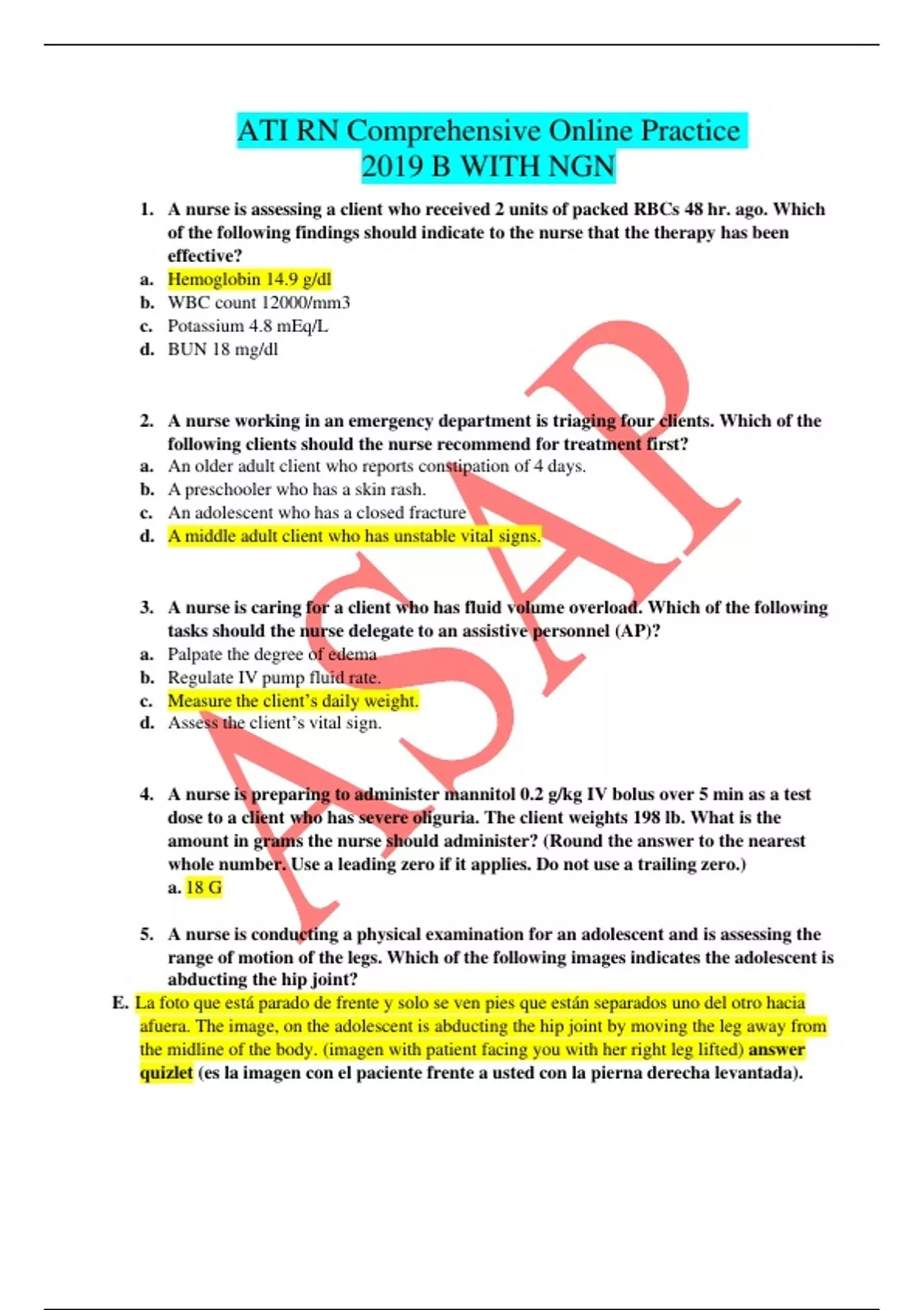 ATI RN Comprehensive Online Practice 2019 B WITH NGN 1. A nurse is assessing a client who received 2 units of packed RBCs 48 hr. ago. Which of the following findings should indicate to the nurse that the therapy has been effective? a. Hemoglobin 14.9 g/dl b. WBC count 12000/mm3 c. Potassium 4.8 mEq/L d. BUN 18 mg/dl 2. A nurse working in an emergency department is triaging four clients. Which of the following clients should the nurse recommend for treatment first? a. An older adult client who reports constipation of 4 days. b. A preschooler who has a skin rash. c. An adolescent who has a closed fracture d. A middle adult client who has unstable vital signs. 3. A nurse is caring for a client who has fluid volume overload. Which of the following tasks should the nurse delegate to an assistive personnel (AP)? a. Palpate the degree of edema b. Regulate IV pump fluid rate. c. Measure the client’s daily weight. d. Assess the client’s vital sign. 4. A nurse is preparing to administer mannitol 0.2 g/kg IV bolus over 5 min as a test dose to a client who has severe oliguria. The client weights 198 lb. What is the amount in grams the nurse should administer? (Round the answer to the nearest whole number. Use a leading zero if it applies. Do not use a trailing zero.) a. 18 G 5. A nurse is conducting a physical examination for an adolescent and is assessing the range of motion of the legs. Which of the following images indicates the adolescent is abducting the hip joint? E. La foto que está parado de frente y solo se ven pies que están separados uno del otro hacia afuera. The image, on the adolescent is abducting the hip joint by moving the leg away from the midline of the body. (imagen with patient facing you with her right leg lifted) answer quizlet (es la imagen con el paciente frente a usted con la pierna derecha levantada). 6. A nurse is caring for a client who has hyperthyroidism. Which of the following findings should the nurse expect? a. Dry, coarse hair b. Bradycardia c. Tremors d. Periorbital edema 7. A nurse is assessing a school-age child who has bacterial meningitis. Which of the following findings should the nurse expect? a. Nuchal rigidity b. Weight gain c. Tinnitus d. Positive Trendelenburg sign. 8. A nurse is assessing a newborn’s heart rate. Which of the following actions should the nurse take? a. Assess the apical pulse is most accurate when the newborn is in a quiet state. The sound of crying obscures the heart sounds. b. Palpate the radial pulse for 30 seconds. c. Listen to the apical pulse while palpating the radial pulse. d. Auscultate the apical pulse at least 1 min. 9. A nurse is preparing to assist with a thoracentesis for a client who has pleurisy. The nurse should plan to perform which of the following actions? a. Administer a bowel preparation the night before the procedure. b. Place the client on bed rest for 24 hr after the procedure. c. Perform pulmonary function tests following the procedure. d. Instruct the client to avoid coughing during the procedure. 10. A nurse in the emergency department is assessing a preschooler who has a facial laceration. The nurse should identify which of the following findings as a potential indication of child sexual abuse? a. A child exhibits discomfort while walking. b. The child has thin extremities. c. The child has bruises on the upper back. d. The child is wearing a stained shirt. 11. A nurse is preparing to teach about dietary management to a client who has Crohn’s disease and an entero-enteric fistula. Which of the following nutrients should the nurse instruct the client to decrease in their diet? a. Calories b. Protein c. Potassium d. Fiber. 12. A nurse is caring for a client who has a prescription for a continuous passive motion (CPM) machine following a total knee arthroplasty. Which of the following actions should the nurse take? a. Turn off the CPM machine during mealtime. b. Maintain the client’s affected hip in an externally rotated position. c. Instruct the client how to adjust the CPM setting for comfort. d. Store the CPM machine under the client’s bed when not in use. 13. A nurse is preparing to initiate IV access for an older adult client. Which of the following sites should the nurse select when initiating the IV for this client? a. Radial vein of the inner arm. b. Great saphenous vein of the leg. c. Dorsal plexus vein of the foot. d. Basilic vein of the hand. 14. A nurse is developing a client education program about osteoporosis for older adult clients. The nurse should include which of the following variables as a risk factor for osteoporosis? a. Obesity b. Acromegaly c. Estrogen replacement therapy. d. Sedentary lifestyle. 15. A nurse in an emergency department is caring for a child who has a fever and fluid- filled vesicles on the trunk and extremities. Which of the following interventions should the nurse identify as the priority? a. Encourage oral fluids. b. Apply topical calamine lotion c. Administer acetaminophen as an antipyretic. d. Initiate transmission-based precautions. 16. A nurse is carin