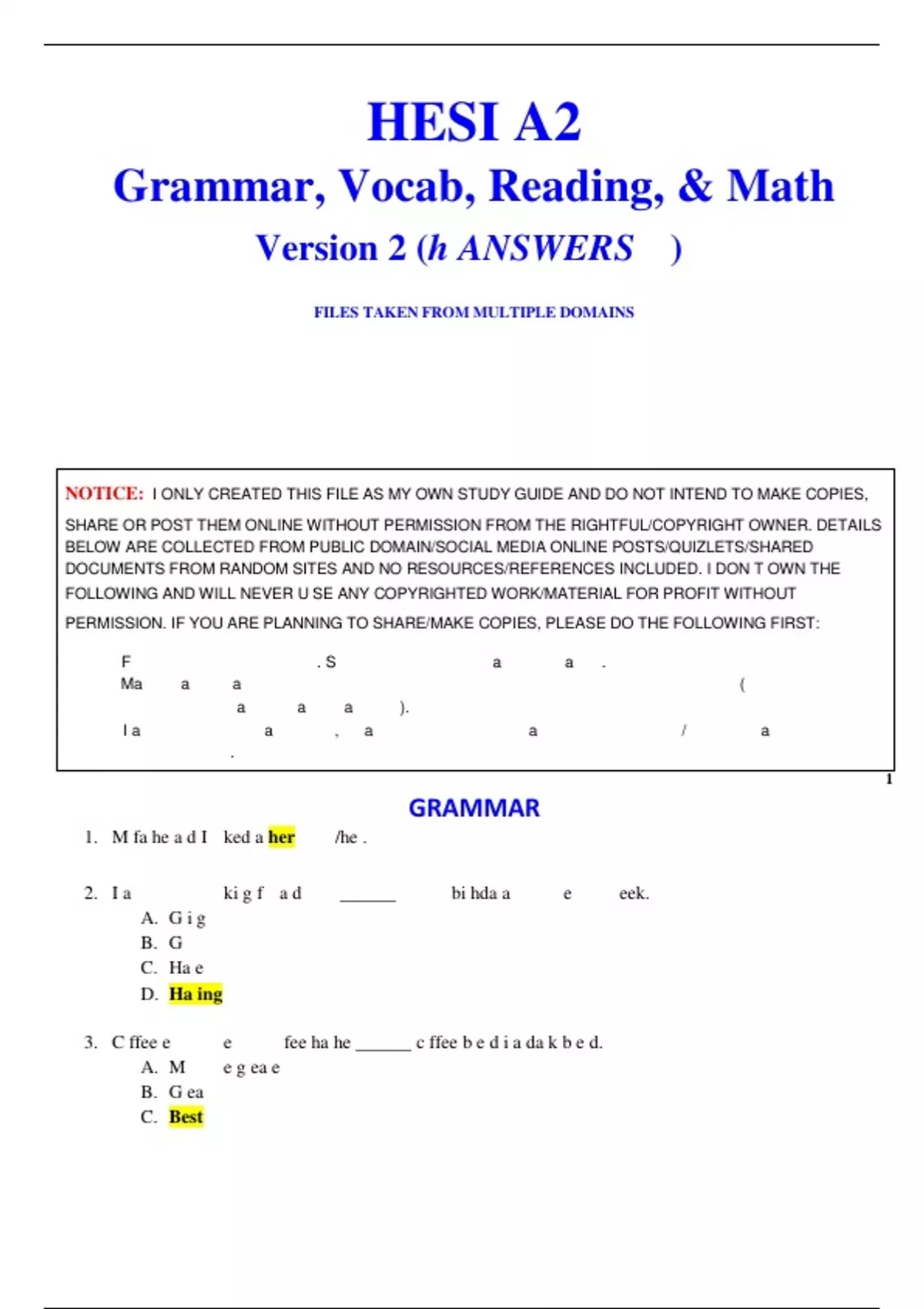 HESI A2 Grammar, Vocab, Reading, & Math Version 2 (h ANSWERS )