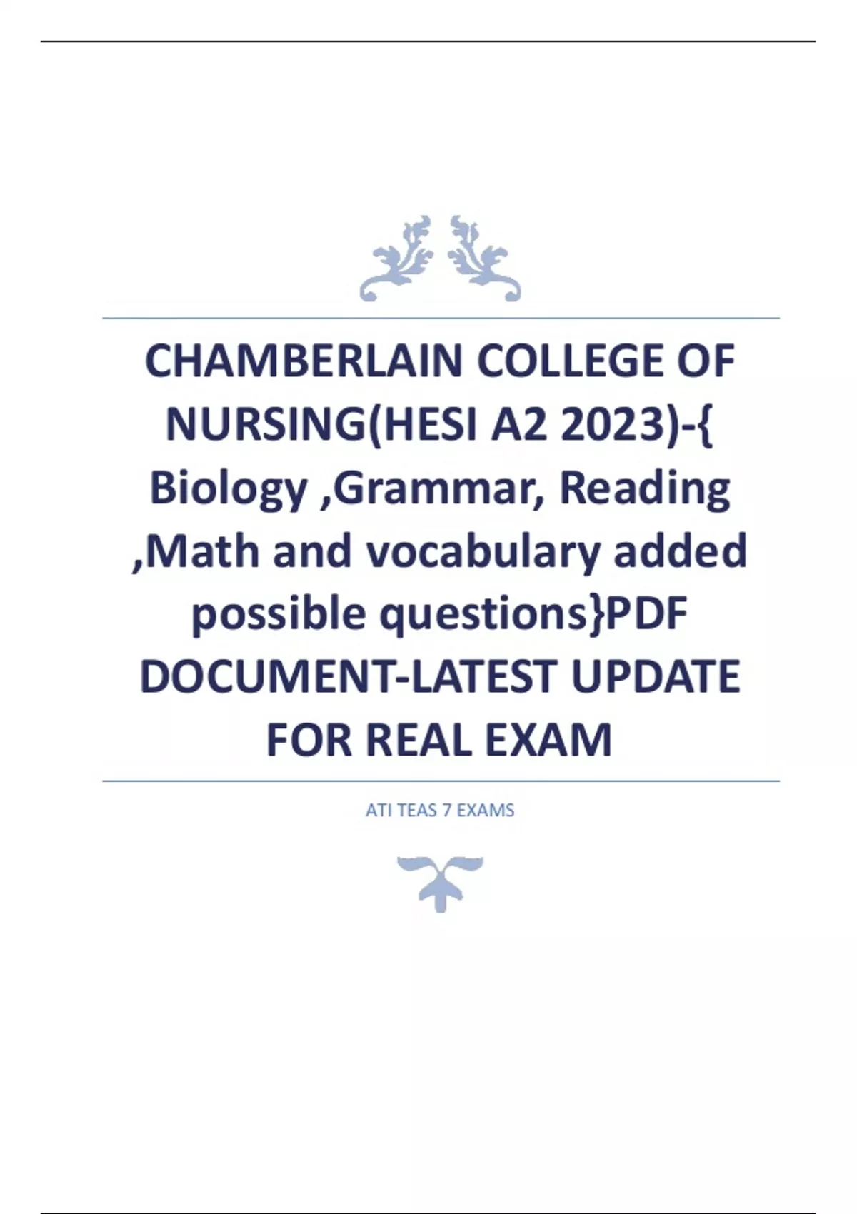 CHAMBERLAIN COLLEGE OF NURSING(HESI A2 2023)-{ Biology ,Grammar, Reading ,Math and vocabulary added possible questions}PDF DOCUMENT-LATEST UPDATE FOR REAL EXAM