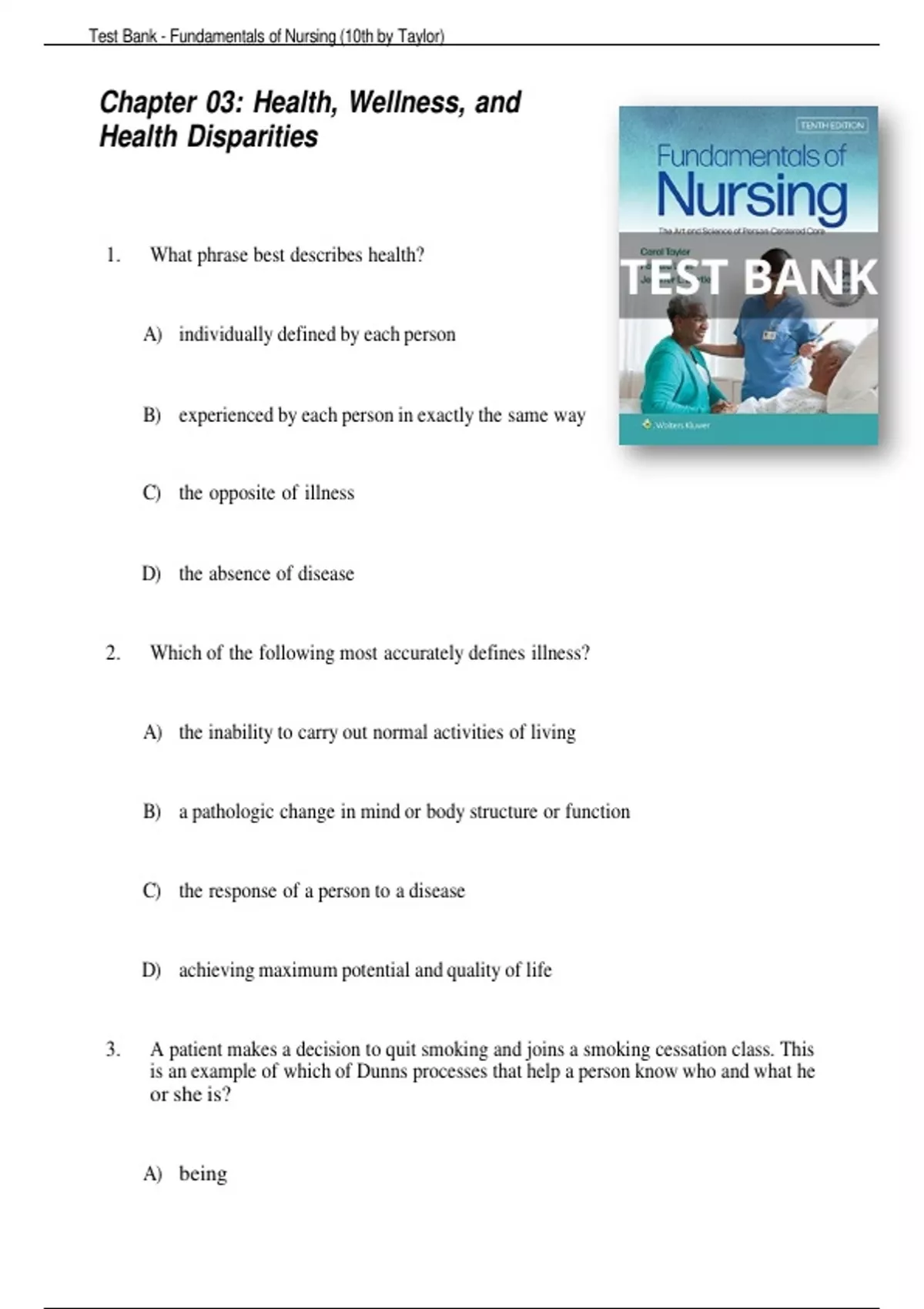 1. What phrase best describes health? A) individually defined by each person B) experienced by each person in exactly the same way C) the opposite of illness D) the absence of disease 2. Which of the following most accurately defines illness? A) the inability to carry out normal activities of living B) a pathologic change in mind or body structure or function C) the response of a person to a disease D) achieving maximum potential and quality of life