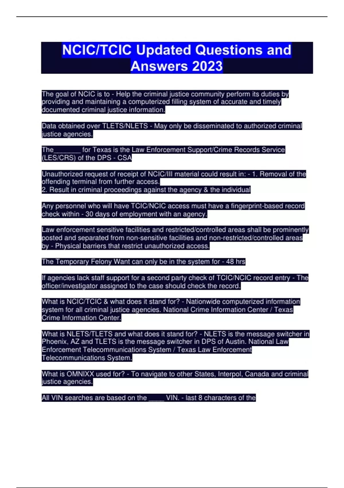 NCIC/TCIC Updated Questions and Answers 2023