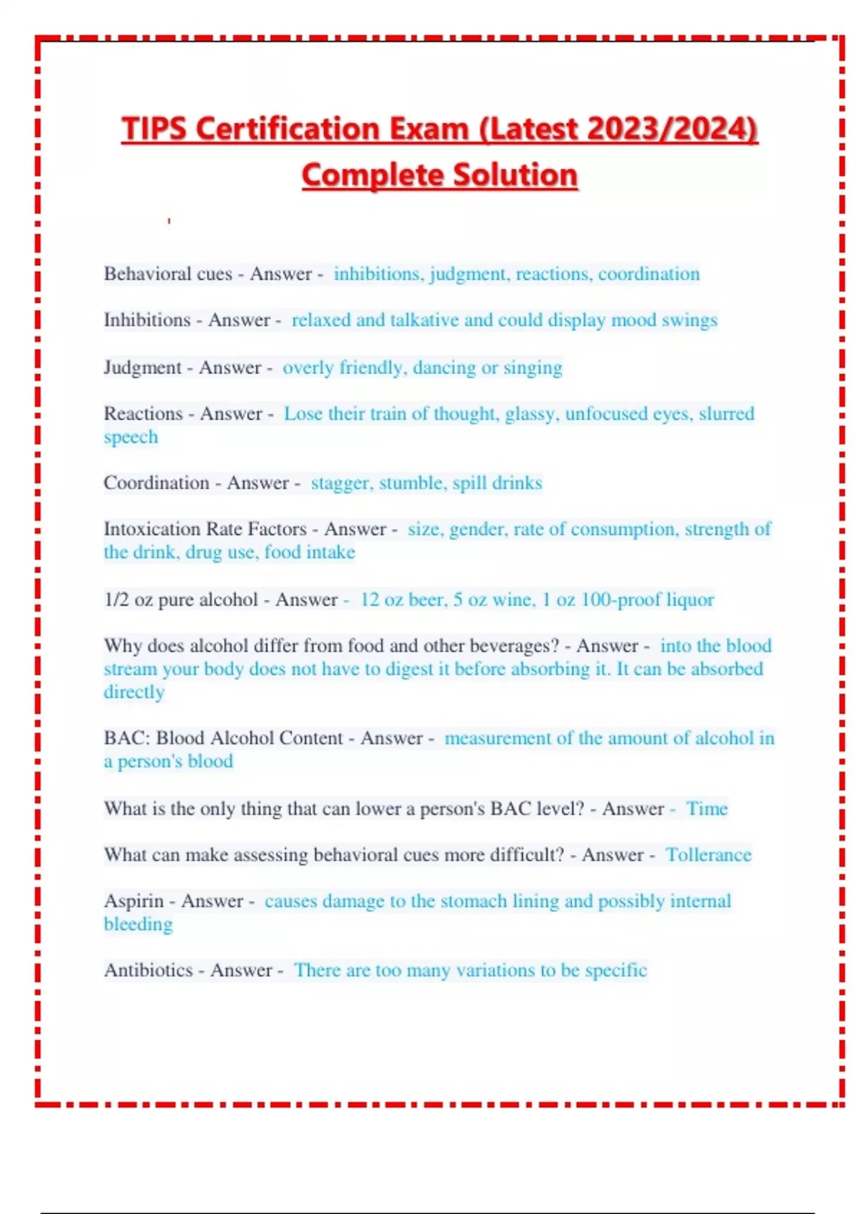 TIPS Certification Exam (Latest 2023/2024) Complete Solution Behavioral cues - Answer - inhibitions, judgment, reactions, coordination Inhibitions - Answer - relaxed and talkative and could display mood swings Judgment - Answer - overly friendly, dancing or singing Reactions - Answer - Lose their train of thought, glassy, unfocused eyes, slurred speech Coordination - Answer - stagger, stumble, spill drinks Intoxication Rate Factors - Answer - size, gender, rate of consumption, strength of the drink, drug use, food intake 1/2 oz pure alcohol - Answer - 12 oz beer, 5 oz wine, 1 oz 100-proof liquor Why does alcohol differ from food and other beverages? - Answer - into the blood stream your body does not have to digest it before absorbing it. It can be absorbed directly BAC: Blood Alcohol Content - Answer - measurement of the amount of alcohol in a person's blood What is the only thing that can lower a person's BAC level? - Answer - Time What can make assessing behavioral cues more difficult? - Answer - Tollerance Aspirin - Answer - causes damage to the stomach lining and possibly internal bleeding Antibiotics - Answer - There are too many variations to be specific Antihistamines - Answer - Depr