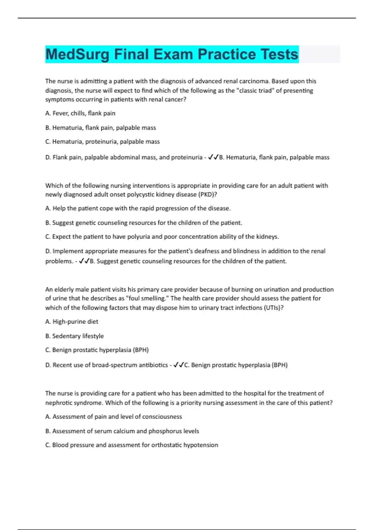 The nurse is admitting a patient with the diagnosis of advanced renal carcinoma. Based upon this diagnosis, the nurse will expect to find which of the following as the "classic triad" of presenting symptoms occurring in patients with renal cancer? A. Fever, chills, flank pain B. Hematuria, flank pain, palpable mass C. Hematuria, proteinuria, palpable mass D. Flank pain, palpable abdominal mass, and proteinuria - B. Hematuria, flank pain, palpable mass Which of the following nursing interventions is appropriate in providing care for an adult patient with newly diagnosed adult onset polycystic kidney disease (PKD)? A. Help the patient cope with the rapid progression of the disease. B. Suggest genetic counseling resources for the children of the patient. C. Expect the patient to have polyuria and poor concentration ability of the kidneys. D. Implement appropriate measures for the patient's deafness and blindness in addition to the renal problems. - B. Suggest genetic counseling resources for the children of the patient. An elderly male patient visits his primary care provider because of burning on urination and production of urine that he describes as "foul smelling." The health care provider should assess the patient for which of the following factors that may dispose him to urinary tract infections (UTIs)? A. High-purine diet B. Sedentary lifestyle C. Benign prostatic hyperplasia (BPH) D. Recent use of broad-spectrum antibiotics - C. Benign prostatic hyperplasia (BPH) The nurse is providing care for a patient who has been admitted to the hospital for the treatment of nephrotic syndrome. Which of the following is a priority nursing assessment in the care of this patient? A. Assessment of pain and level of consciousness B. Assessment of serum calcium and phosphorus levels C. Blood pressure and assessment for orthostatic hypotension