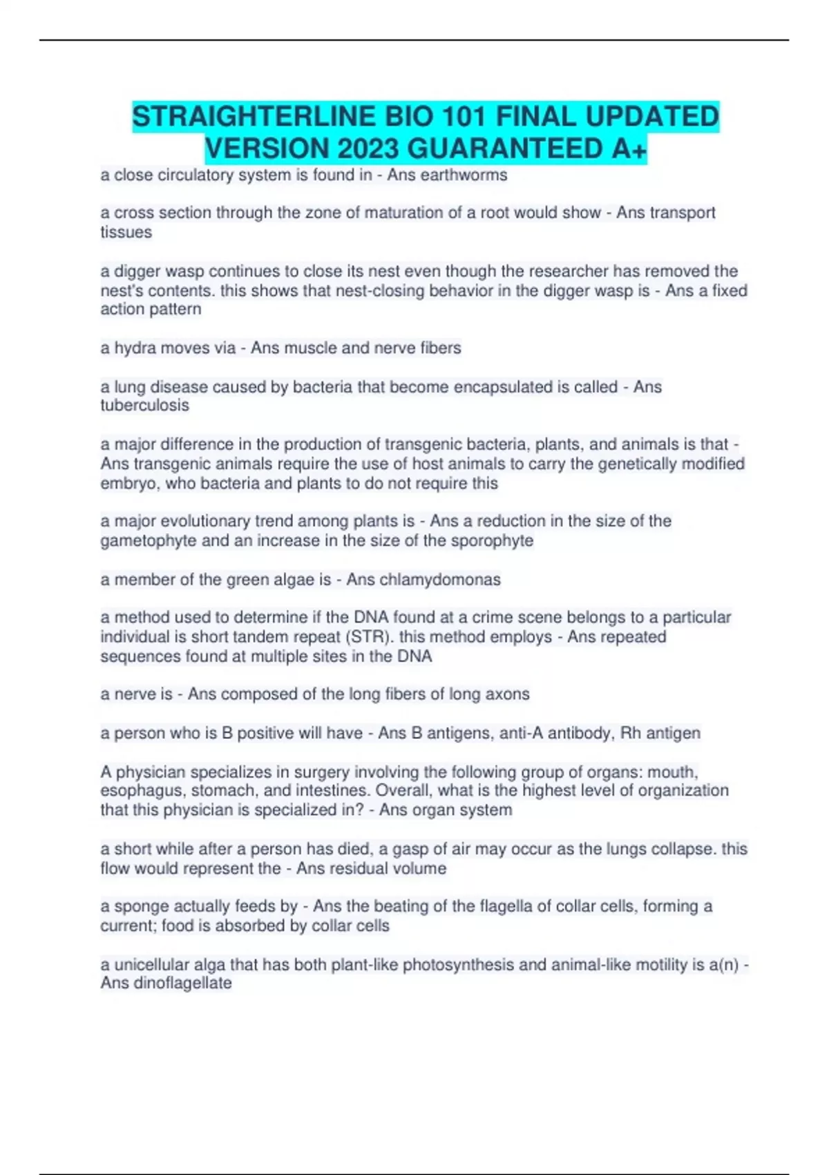STRAIGHTERLINE BIO 101 FINAL UPDATED VERSION 2023 GUARANTEED A+