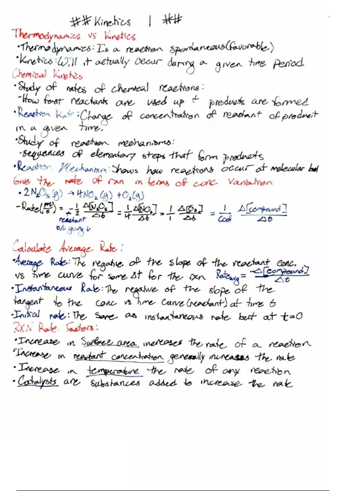 Notes taken on the topic of Kinetics as taught by Dr. Williamson in CHEM 120 at TAMU. These notes contain information about the kinetics of chemical reactions starting with the bases of reaction rate and reaction mechanisms. It describes how to calculate average, instantaneous, and initial rates of reactions and the factors such as surface area, concentration, temperature, and catalysts that affect these reactions. It then describes collision theory, rate law, and the rate constant k and its factors. Next, it explores the integrated rate equations in zero, first, and second-order reactions and their associated graphs. Transition State Theory is then discussed with energy vs reaction graphs explored and the Arrhenius Equation shown and discussed. Finally, it goes further into depth about reaction mechanisms and rate law rules, as well as catalysts.