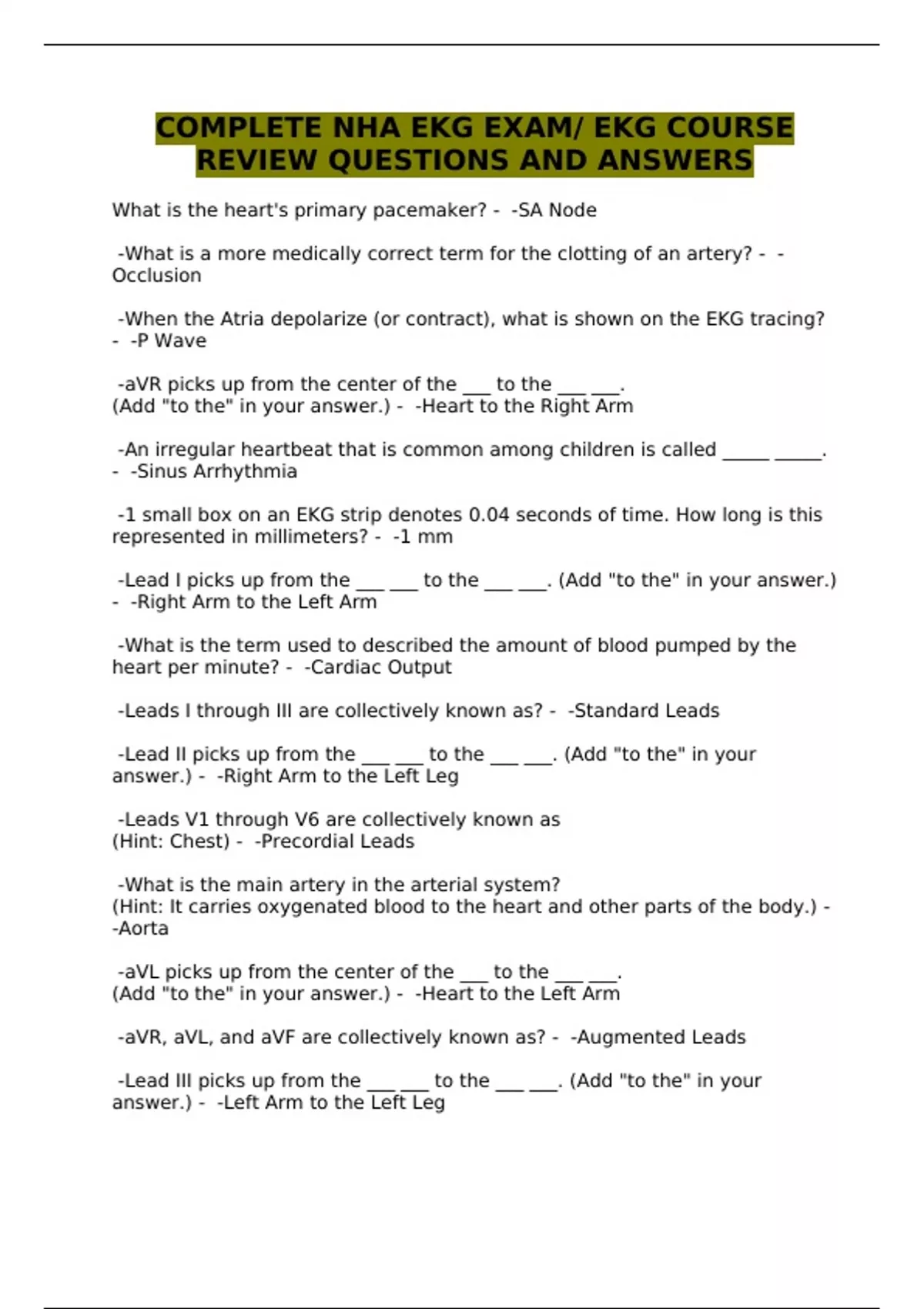 COMPLETE NHA EKG EXAM/ EKG COURSE REVIEW QUESTIONS AND ANSWERS