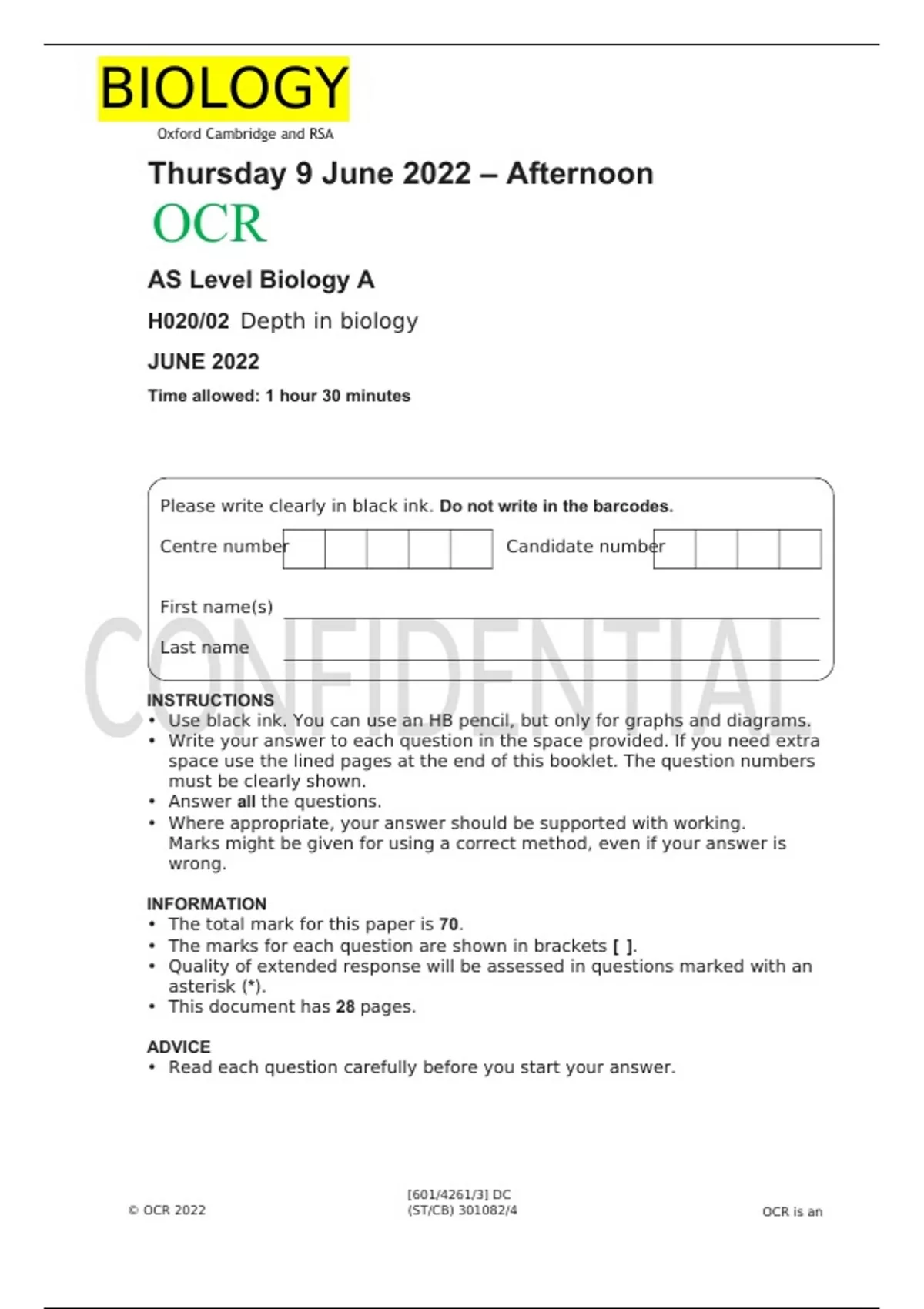 OCR AS Level Biology A H020/02 JUNE 2022 FINAL QUESTION PAPER Depth in biology