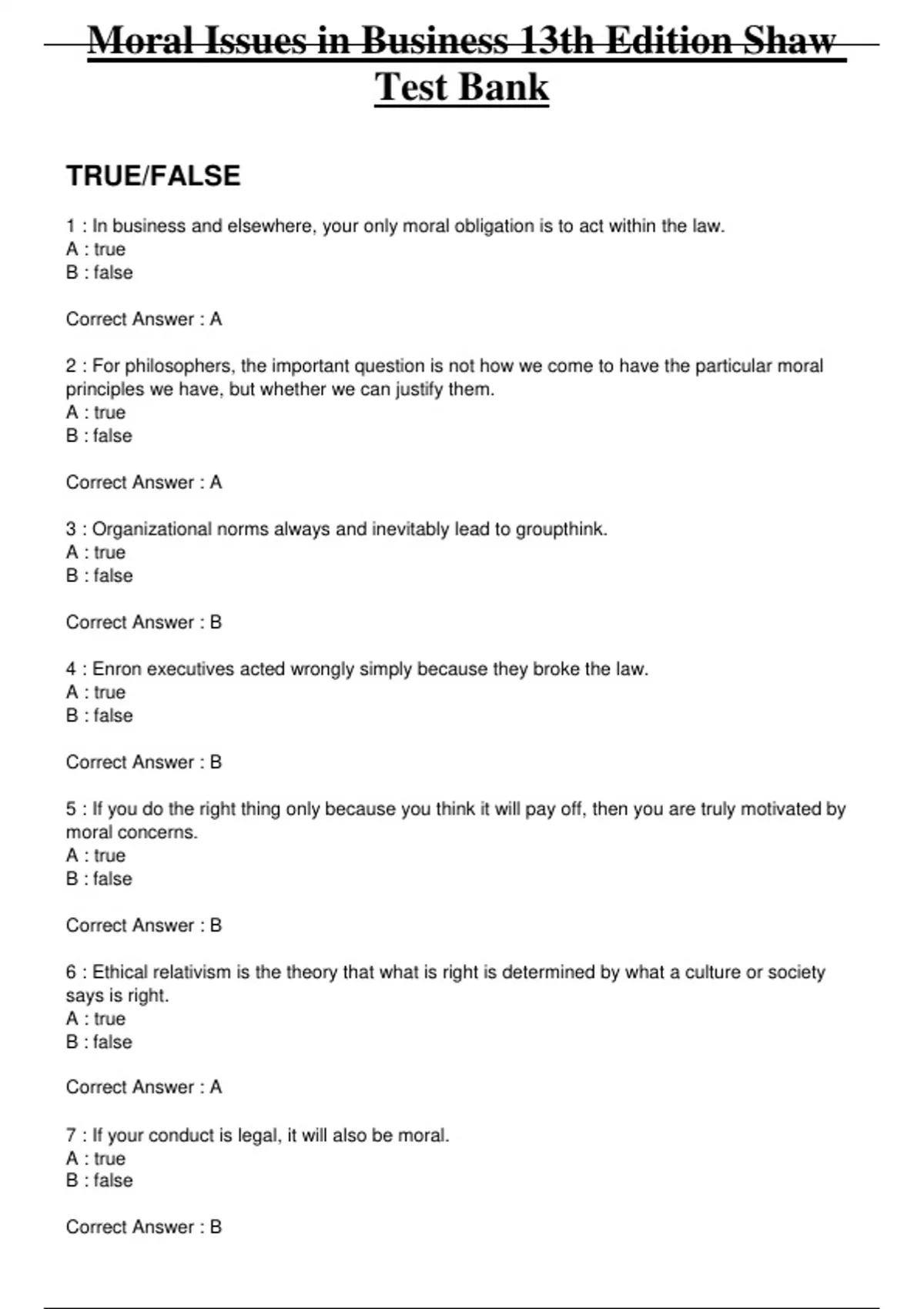 Complete Test Bank Moral Issues in Business 13th Edition Shaw Questions & Answers with rationales (Chapter 1-11)