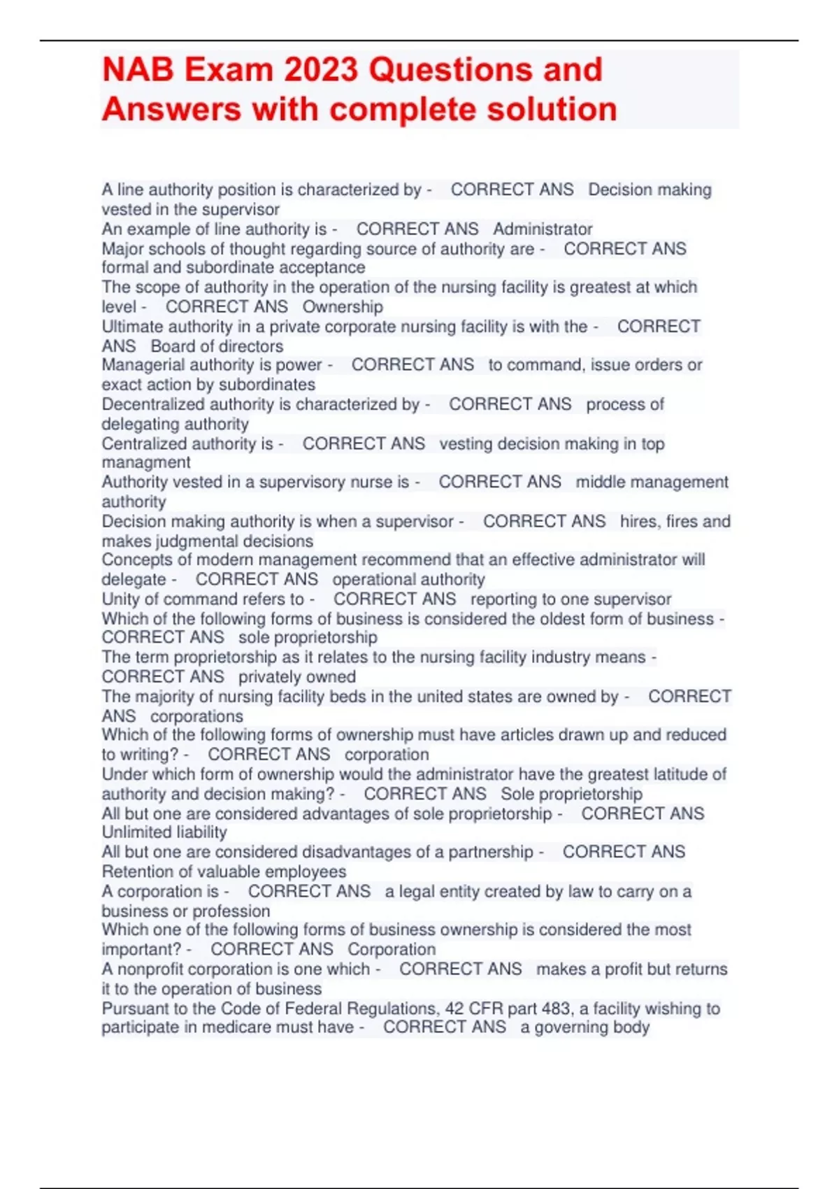 A line authority position is characterized by - CORRECT ANS Decision making vested in the supervisor An example of line authority is - CORRECT ANS Administrator Major schools of thought regarding source of authority are - CORRECT ANS formal and subordinate acceptance The scope of authority in the operation of the nursing facility is greatest at which level - CORRECT ANS Ownership Ultimate authority in a private corporate nursing facility is with the - CORRECT ANS Board of directors Managerial authority is power - CORRECT ANS to command, issue orders or exact action by subordinates Decentralized authority is characterized by - CORRECT ANS process of delegating authority Centralized authority is - CORRECT ANS vesting decision making in top managment Authority vested in a supervisory nurse is - CORRECT ANS middle management authority Decision making authority is when a supervisor - CORRECT ANS hires, fires and makes judgmental decisions Concepts of modern management recommend that an effective administrator will delegate - CORRECT ANS operational authority Unity of command refers to - CORRECT ANS reporting to one supervisor Which of the following forms of business is considered the oldest form of business - CORRECT ANS sole proprietorship The term proprietorship as it relates to the nursing facility industry means - CORRECT ANS privately owned The majority of nursing facility beds in the united states are owned by - CORRECT ANS corporations Which of the following forms of ownership must have articles drawn up and reduced to writing? - CORRECT ANS corporation Under which form of ownership would the administrator have the greatest latitude of authority and decision making? - CORRECT ANS Sole proprietorship All but one are considered advantages of sole proprietorship - CORRECT ANS Unlimited liability All but one are considered disadvantages of a partnership - CORRECT ANS Retention of valuable employees A corporation is - CORRECT ANS a legal entity created by law to carry on a business or profession Which one of the following forms of business ownership is considered the most important? - CORRECT ANS Corporation A nonprofit corporation is one which - CORRECT ANS makes a profit but returns it to the operation of business Pursuant to the Code of Federal Regulations, 42 CFR part 483, a facility wishing to participate in medicare must have - CORRECT ANS a governing body