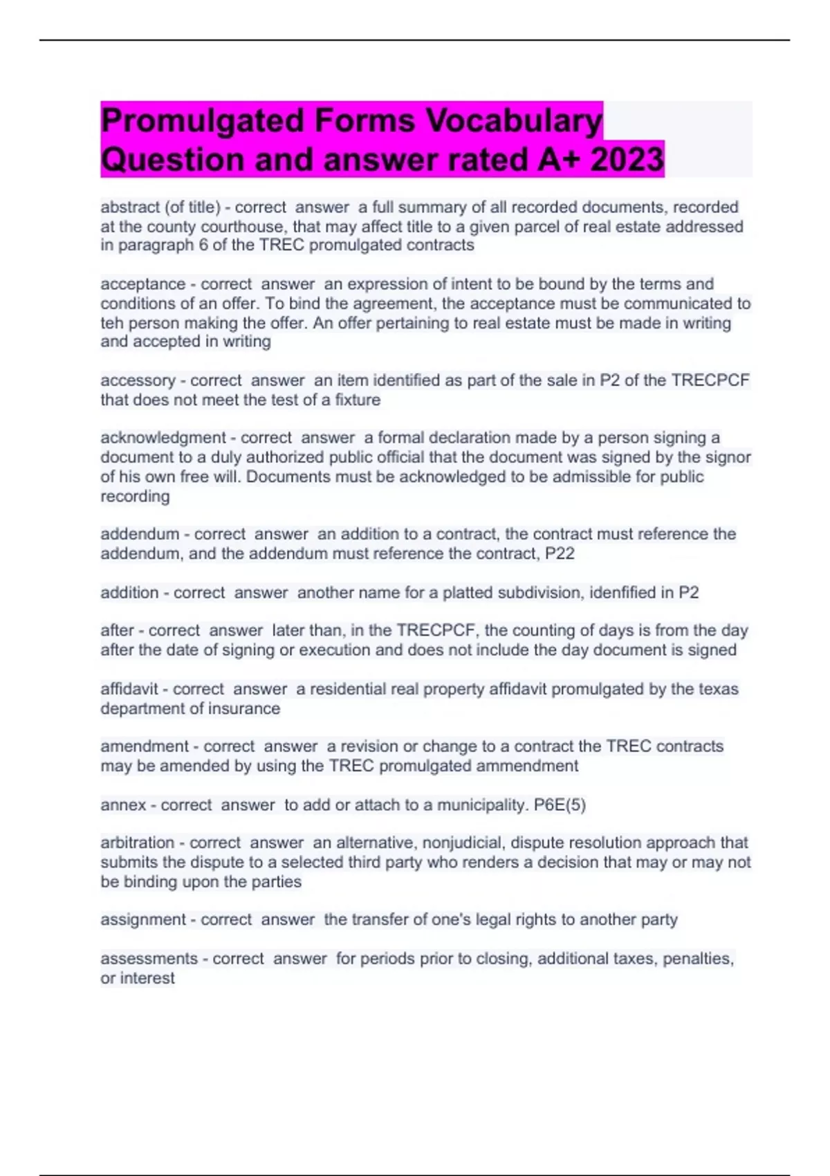 Promulgated Forms Vocabulary Question and answer rated A+ 2023abstract (of title) a full summary of all recorded documents, recorded at the county courthouse, that may affect title to a given parcel of real estate addressed in paragraph 6 of the TREC promulgated contracts acceptance an expression of intent to be bound by the terms and conditions of an offer. To bind the agreement, the acceptance must be communicated to teh person making the offer. An offer pertaining to real estate must be made in writing and accepted in writing accessory an item identified as part of the sale in P2 of the TRECPCF that does not meet the test of a fixture acknowledgment a formal declaration made by a person signing a document to a duly authorized public official that the document was signed by the signor of his own free will. Documents must be acknowledged to be admissible for public recording addendum an addition to a contract, the contract must reference the addendum, and the addendum must reference the contract, P22 addition another name for a platted subdivision, idenfified in P2 after later than, in the TRECPCF, the counting of days is from the day after the date of signing or execution and does not include the day document is signed affidavit a residential real property affidavit promulgated by the texas department of insurance amendment a revision or change to a contract the TREC contracts may be amended by using the TREC promulgated ammendment annex to add or attach to a municipality. P6E(5) arbitration an alternative, nonjudicial, dispute resolution approach that submits the dispute to a selected third party who renders a decision that may or may not be binding upon the parties assignment the transfer of one's legal rights to another party assessments for periods prior to closing, additional taxes, penalties, or interest