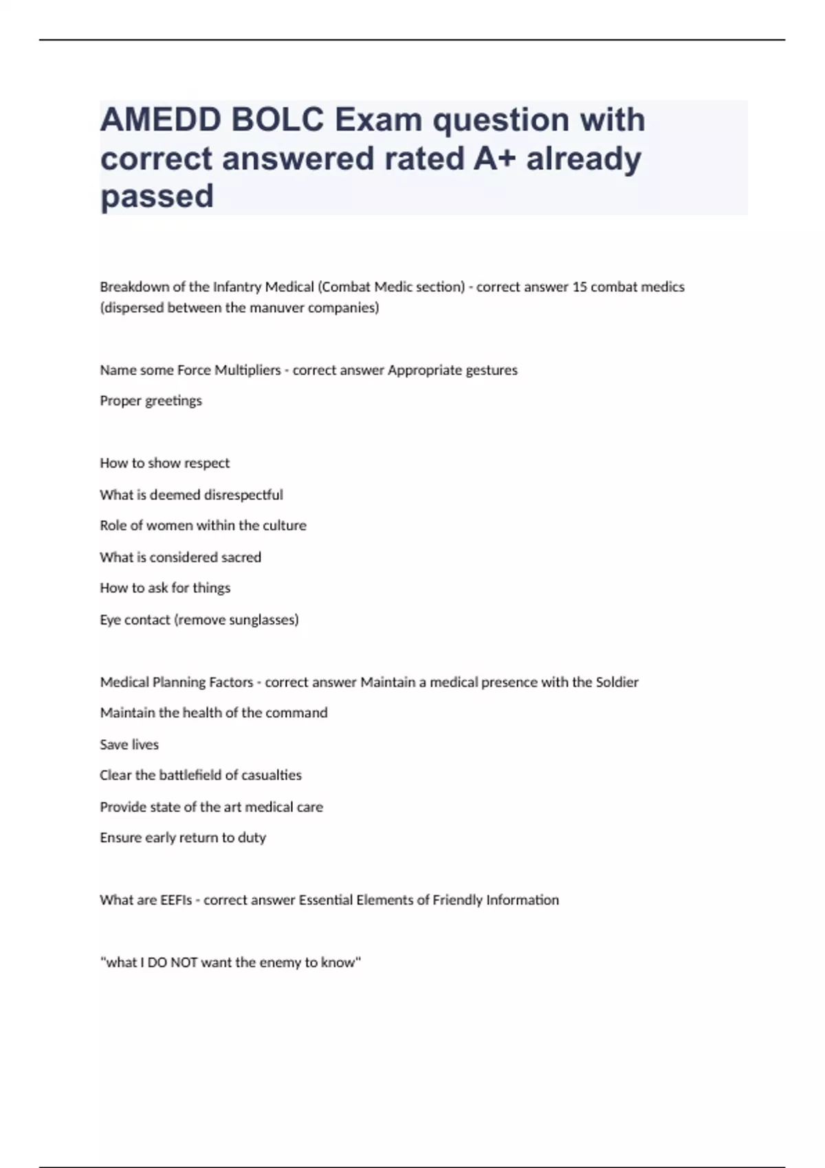 AMEDD BOLC Exam question with correct answered rated A+ already passedBreakdown of the Infantry Medical (Combat Medic section) - correct answer 15 combat medics (dispersed between the manuver companies) Name some Force Multipliers - correct answer Appropriate gestures Proper greetings How to show respect What is deemed disrespectful Role of women within the culture What is considered sacred How to ask for things Eye contact (remove sunglasses) Medical Planning Factors - correct answer Maintain a medical presence with the Soldier Maintain the health of the command Save lives Clear the battlefield of casualties Provide state of the art medical care Ensure early return to duty What are EEFIs - correct answer Essential Elements of Friendly Information "what I DO NOT want the enemy to know"