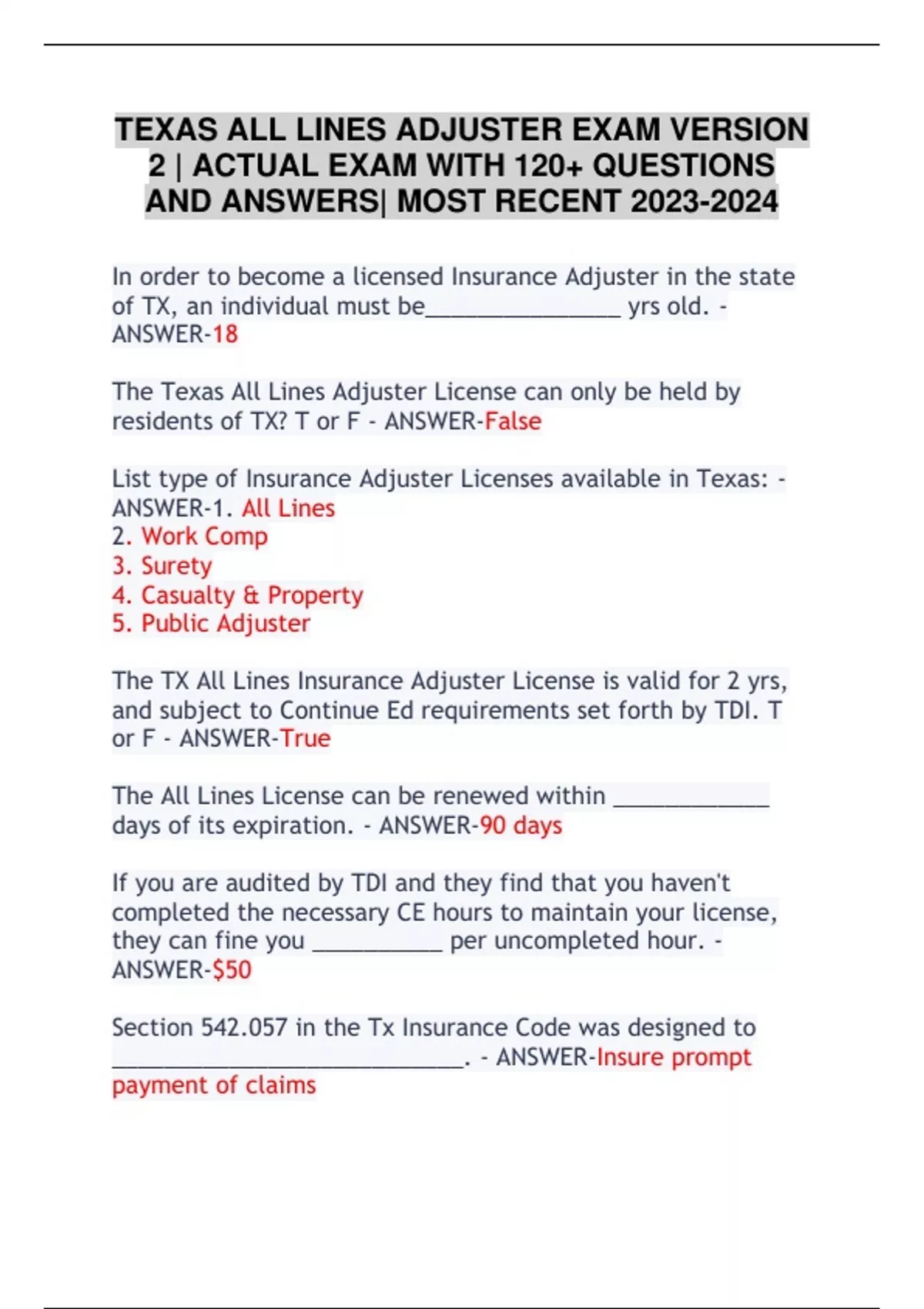 TEXAS ALL LINES ADJUSTER EXAM VERSION 2 | ACTUAL EXAM WITH 120+ QUESTIONS AND ANSWERS| MOST RECENT In order to become a licensed Insurance Adjuster in the state of TX, an individual must be_______________ yrs old. - ANSWER-18 The Texas All Lines Adjuster License can only be held by residents of TX? T or F - ANSWER-False List type of Insurance Adjuster Licenses available in Texas: - ANSWER-1. All Lines 2. Work Comp 3. Surety 4. Casualty & Property 5. Public Adjuster