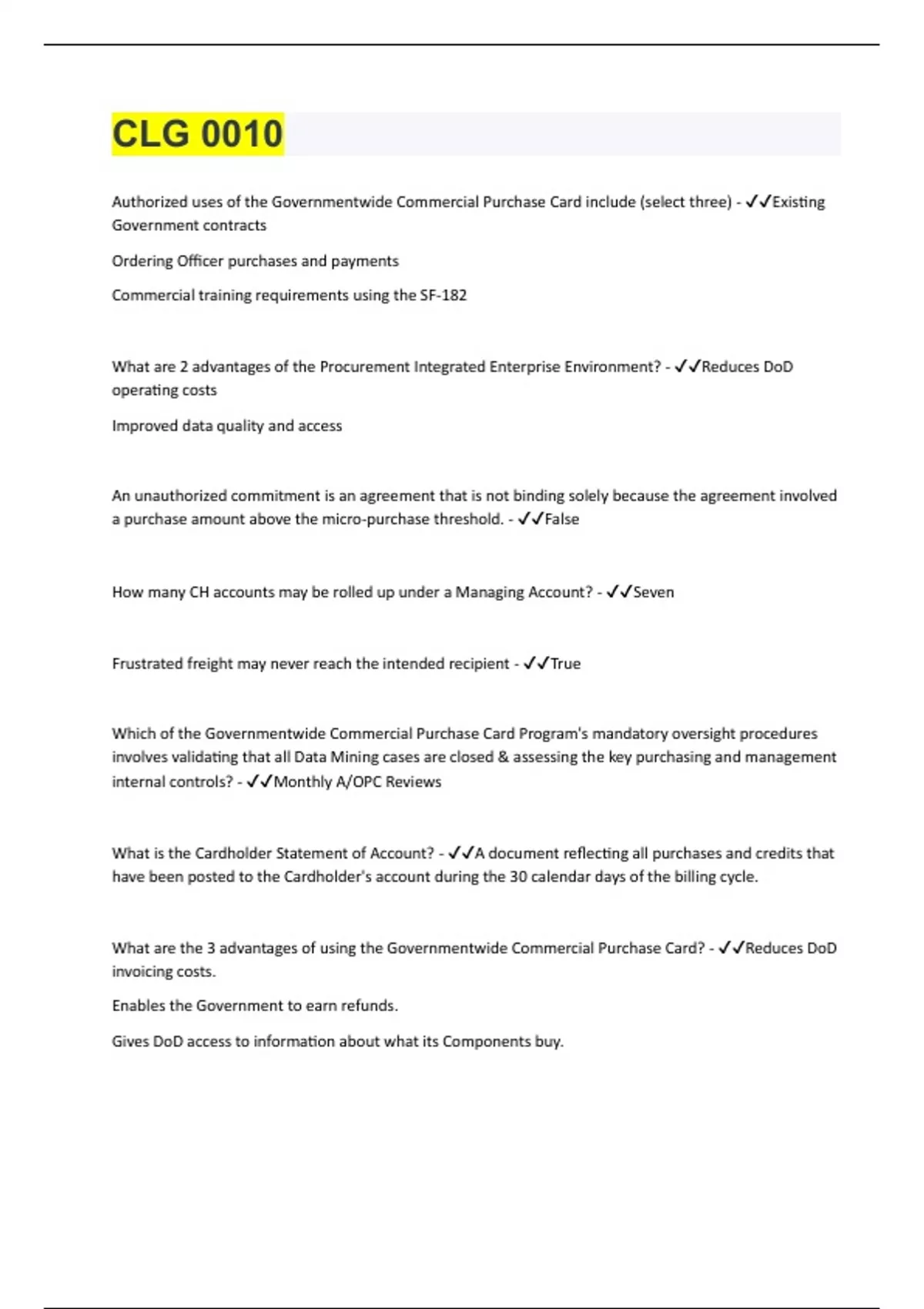 Authorized uses of the Governmentwide Commercial Purchase Card include (select three) - Existing Government contracts Ordering Officer purchases and payments Commercial training requirements using the SF-182 What are 2 advantages of the Procurement Integrated Enterprise Environment? - Reduces DoD operating costs Improved data quality and access An unauthorized commitment is an agreement that is not binding solely because the agreement involved a purchase amount above the micro-purchase threshold. - False How many CH accounts may be rolled up under a Managing Account? - Seven Frustrated freight may never reach the intended recipient - True Which of the Governmentwide Commercial Purchase Card Program's mandatory oversight procedures involves validating that all Data Mining cases are closed & assessing the key purchasing and management internal controls? - Monthly A/OPC Reviews What is the Cardholder Statement of Account? - A document reflecting all purchases and credits that have been posted to the Cardholder's account during the 30 calendar days of the billing cycle. What are the 3 advantages of using the Governmentwide Commercial Purchase Card? - Reduces DoD invoicing costs. Enables the Government to earn refunds. Gives DoD access to information about what its Components buy