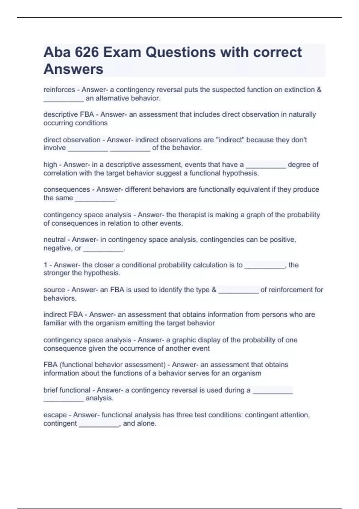 escape - Answer- functional analysis has three test conditions: contingent attention, contingent __________, and alone. descriptive FBA - Answer- the therapist is assessing the function of behavior by observing & recording in the natural environment.