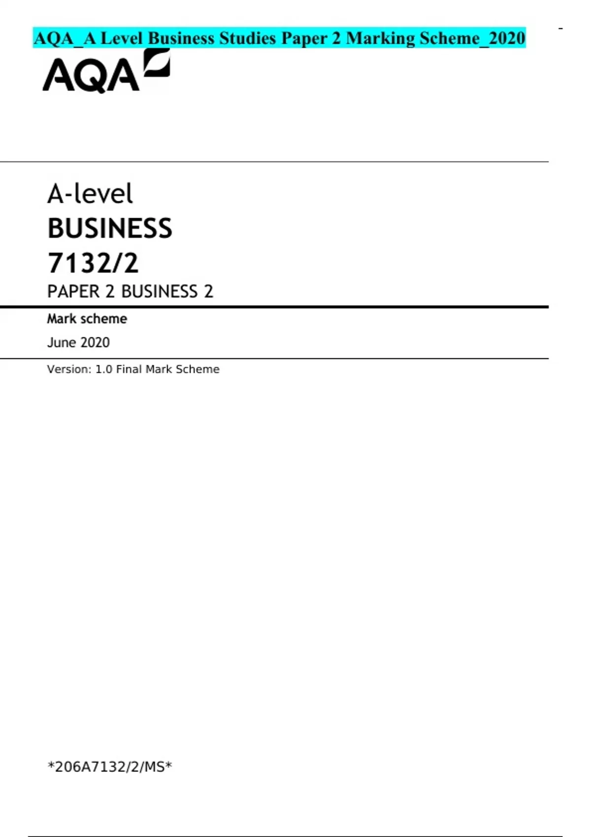 AQA_A Level Business Studies Paper 2 Marking Scheme_2020