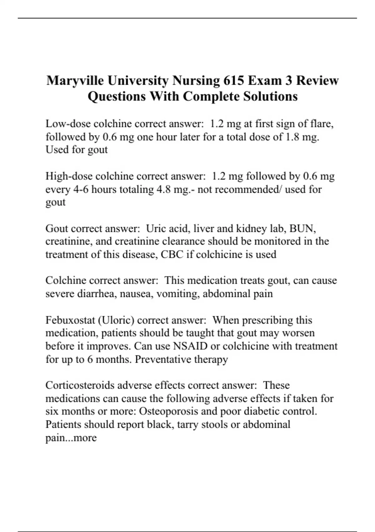Low-dose colchine correct answer: 1.2 mg at first sign of flare, followed by 0.6 mg one hour later for a total dose of 1.8 mg. Used for gout High-dose colchine correct answer: 1.2 mg followed by 0.6 mg every 4-6 hours totaling 4.8 mg.- not recommended/ used for gout Gout correct answer: Uric acid, liver and kidney lab, BUN, creatinine, and creatinine clearance should be monitored in the treatment of this disease, CBC if colchicine is used Colchine correct answer: This medication treats gout, can cause severe diarrhea, nausea, vomiting, abdominal pain Febuxostat (Uloric) correct answer: When prescribing this medication, patients should be taught that gout may worsen before it improves. Can use NSAID or colchicine with treatment for up to 6 months. Preventative therapy Corticosteroids adverse effects correct answer: These medications can cause the following adverse effects if taken for six months or more: Osteoporosis and poor diabetic control. Patients should report black, tarry stools or abdominal pain...more Corticosteroids correct answer: These medications