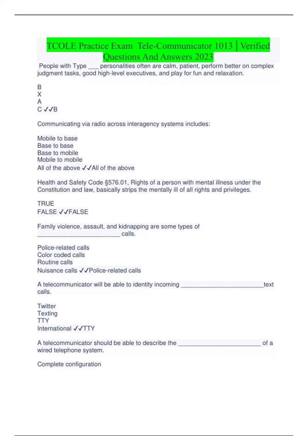 TCOLE Practice Exam Tele-Communicator 1013 | Verified Questions And Answers 2023 People with Type ___ personalities often are calm, patient, perform better on complex judgment tasks, good high-level executives, and play for fun and relaxation. B X A C B Communicating via radio across interagency systems includes: Mobile to base Base to base Base to mobile Mobile to mobile All of the above All of the above Health and Safety Code §576.01, Rights of a person with mental illness under the Constitution and law, basically
