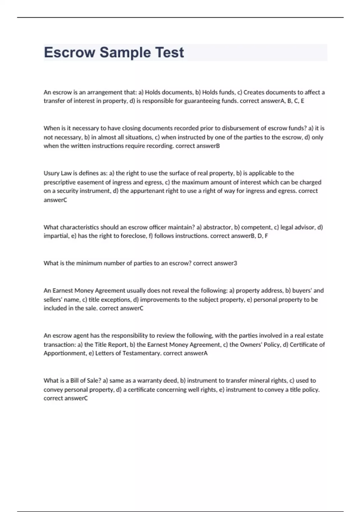 An escrow is an arrangement that: a) Holds documents, b) Holds funds, c) Creates documents to affect a transfer of interest in property, d) is responsible for guaranteeing funds. A, B, C, E When is it necessary to have closing documents recorded prior to disbursement of escrow funds? a) it is not necessary, b) in almost all situations, c) when instructed by one of the parties to the escrow, d) only when the written instructions require recording. B Usury Law is defines as: a) the right to use the surface of real property, b) is applicable to the prescriptive easement of ingress and egress, c) the maximum amount of interest which can be charged on a security instrument, d) the appurtenant right to use a right of way for ingress and egress. C What characteristics should an escrow officer maintain? a) abstractor, b) competent, c) legal advisor, d) impartial, e) has the right to foreclose, f) follows instructions. B, D, F What is the minimum number of parties to an escrow? 3 An Earnest Money Agreement usually does not reveal the following: a) property address, b) buyers' and sellers' name, c) title exceptions, d) improvements to the subject property, e) personal property to be included in the sale. C An escrow agent has the responsibility to review the following, with the parties involved in a real estate transaction: a) the Title Report, b) the Earnest Money Agreement, c) the Owners' Policy, d) Certificate of Apportionment, e) Letters of Testamentary. A