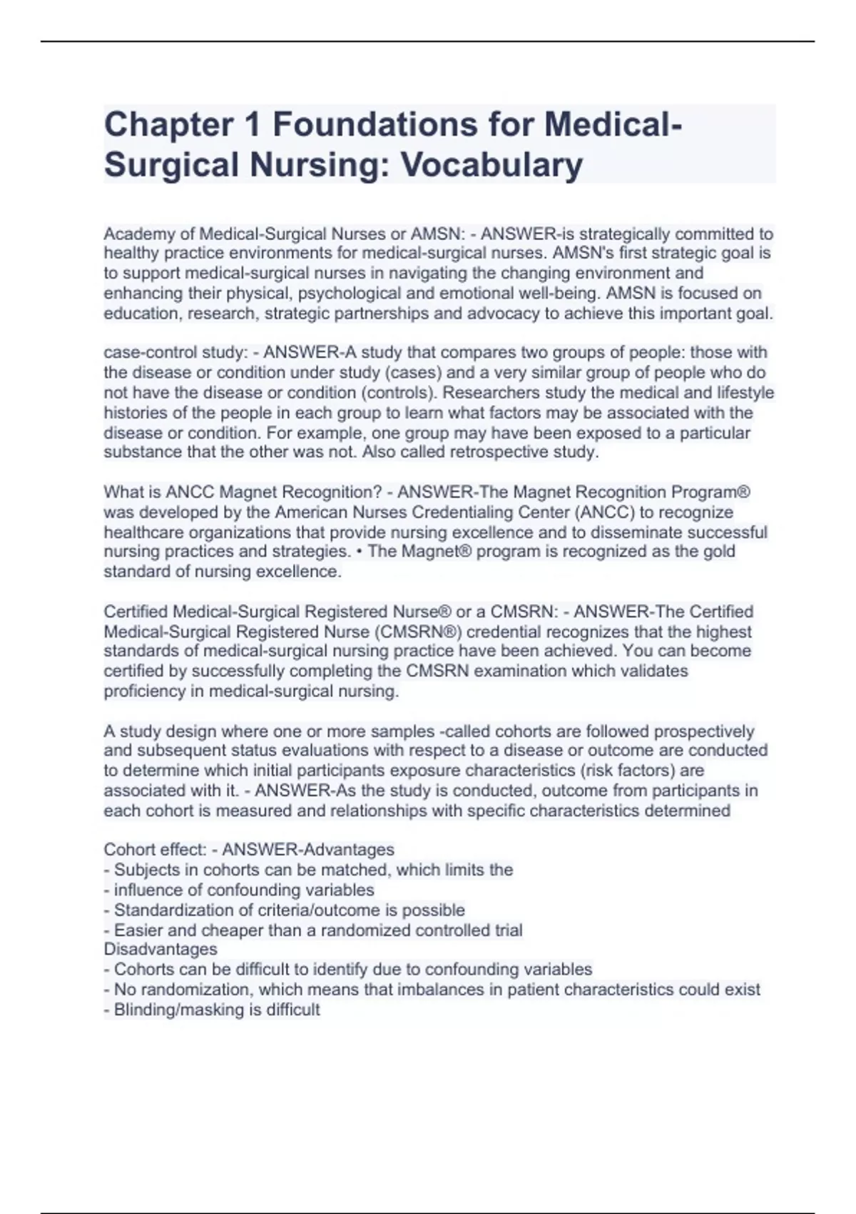 Chapter 1 Foundations for Medical-Surgical Nursing: VocabularyChapter 1 Foundations for Medical-Surgical Nursing: VocabularyChapter 1 Foundations for Medical-Surgical Nursing: VocabularyChapter 1 Foundations for Medical-Surgical Nursing: Vocabulary Academy of Medical-Surgical Nurses or AMSN: - ANSWER-is strategically committed to healthy practice environments for medical-surgical nurses. AMSN's first strategic goal is to support medical-surgical nurses in navigating the changing environment and enhancing their physical, psychological and emotional well-being. AMSN is focused on education, research, strategic partnerships and advocacy to achieve this important goal. case-control study: - ANSWER-A study that compares two groups of people: those with the disease or condition under study (cases) and a very similar group of people who do not have the disease or condition (controls). Researchers study the medical and lifestyle histories of the people in each group to learn what factors may be associated with the disease or condition. For example, one group may have been exposed to a particular substance that the other was not. Also called retrospective study. What is ANCC Magnet Recognition? - ANSWER-The Magnet Recognition Program® was developed by the American Nurses Credentialing Center (ANCC) to recognize healthcare organizations that provide nursing excellence and to disseminate successful nursing practices and strategies. • The Magnet® program is recognized as the gold standard of nursing excellence. Certified Medical-Surgical Registered Nurse® or a CMSRN: - ANSWER-The Certified Medical-Surgical Registered Nurse (CMSRN®) credential recognizes that the highest standards of medical-surgical nursing practice have been achieved. You can become certified by successfully completing the CMSRN examination which validates